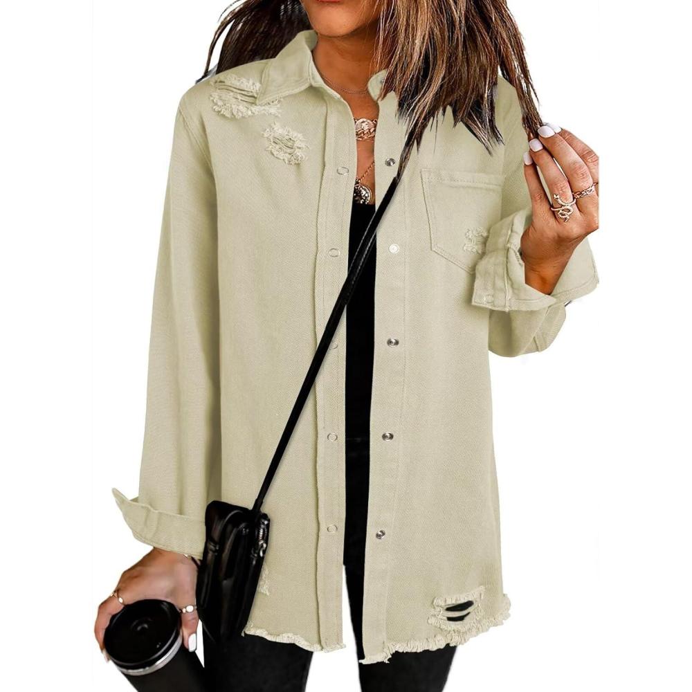 Dokotoo Women’s Oversized Denim Jacket Casual Long Sleeve Denim Shirts Distresse Jean Jacket(A1 Apricot)