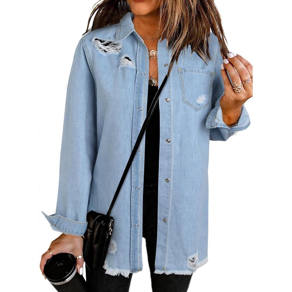 Dokotoo Women’s Oversized Denim Jacket Casual Long Sleeve Denim Shirts Distresse Jean Jacket(A1 Sky Blue)