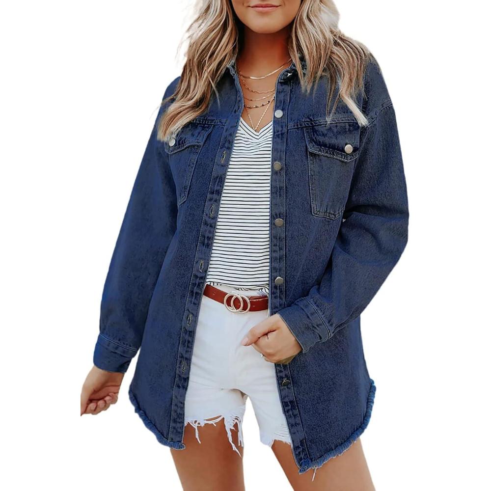 Dokotoo Women’s Oversized Denim Jacket Casual Long Sleeve Denim Shirts Distresse Jean Jacket(B3 Blue)