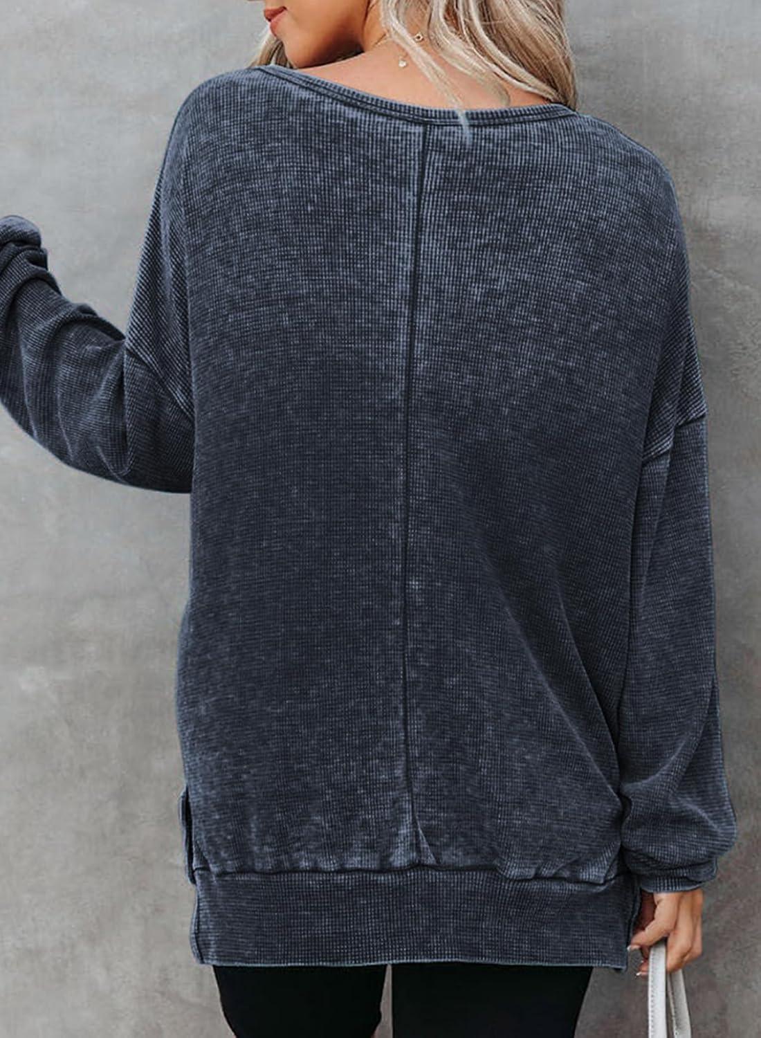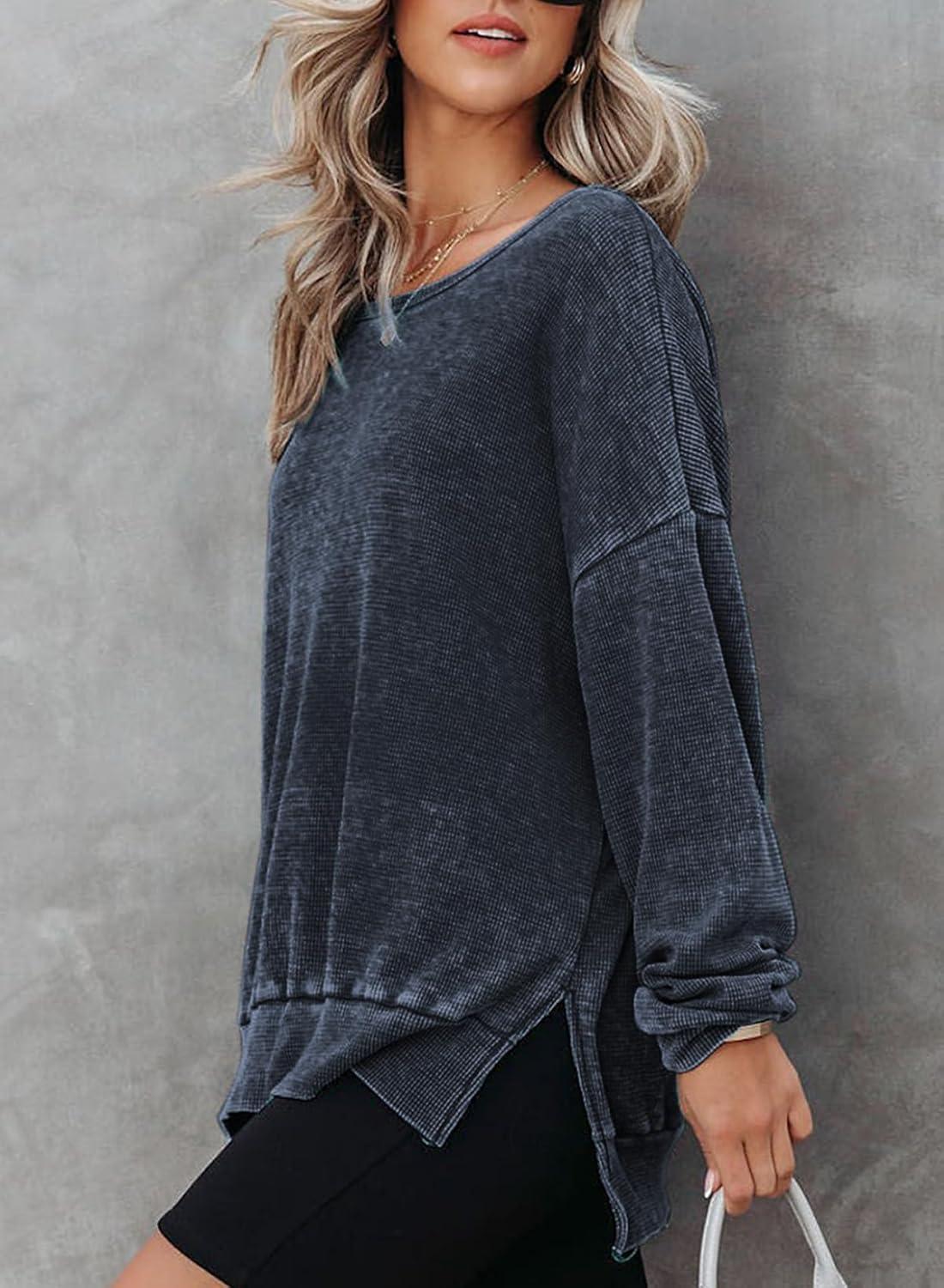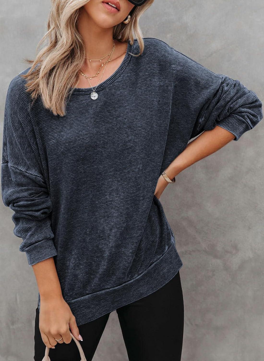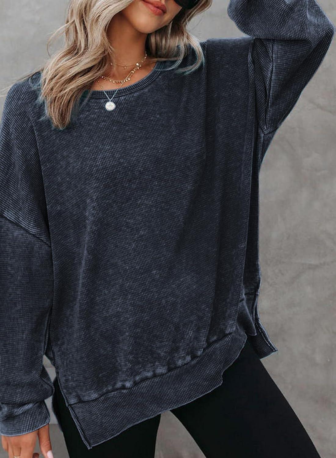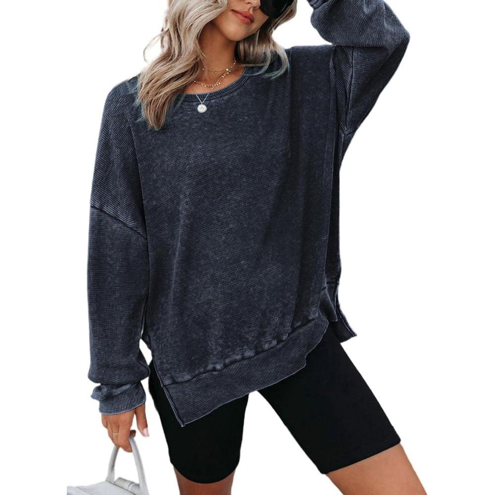 Dokotoo Womens Oversized Waffle Knit Crewneck Sweatshirts Long Sleeve Side Slits Casual Pullover Sweatshirt Tops(Blue)