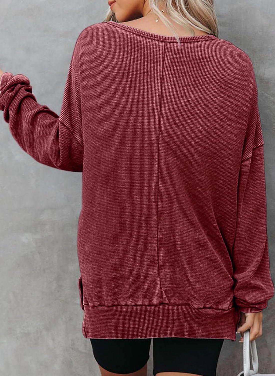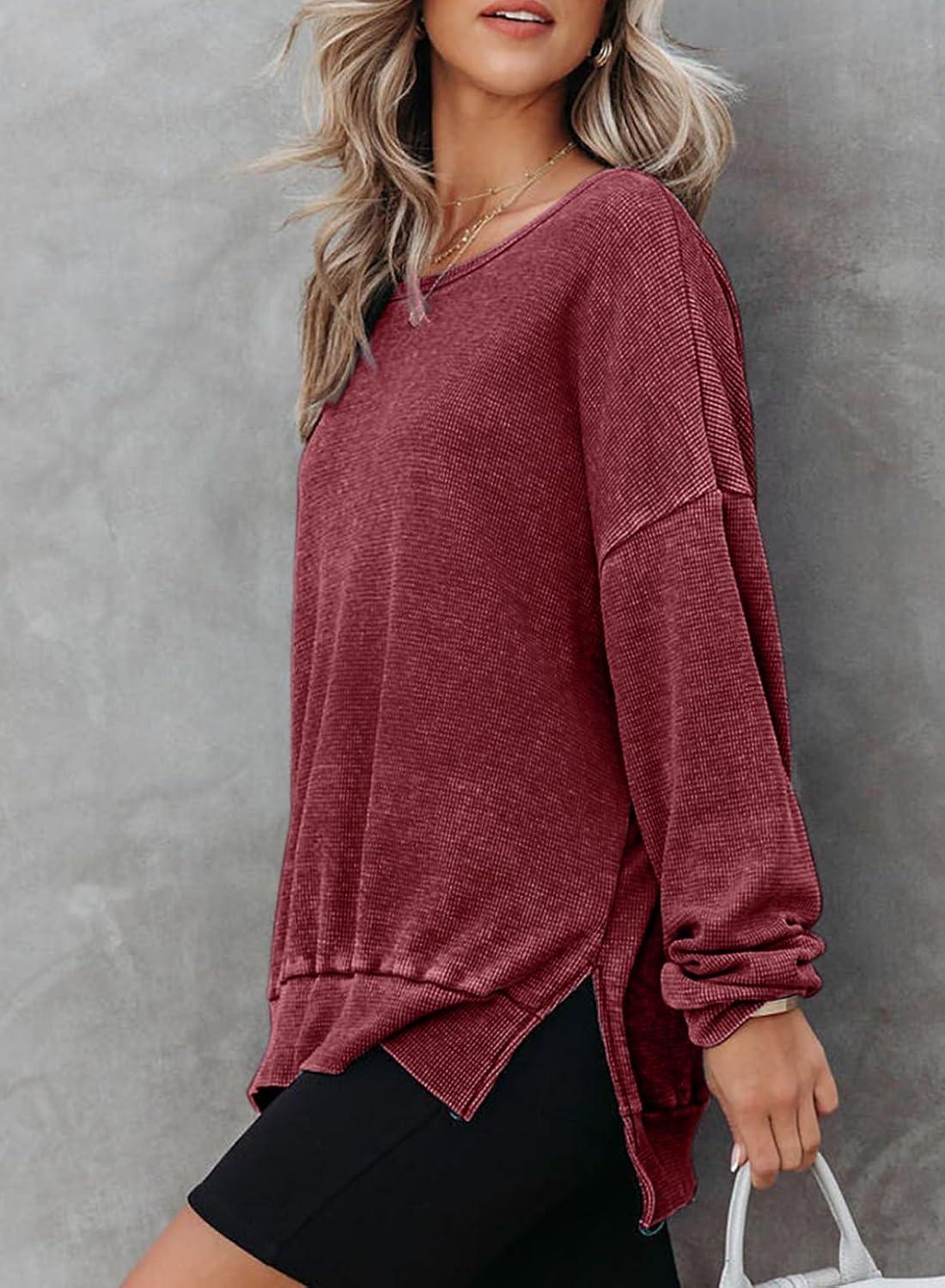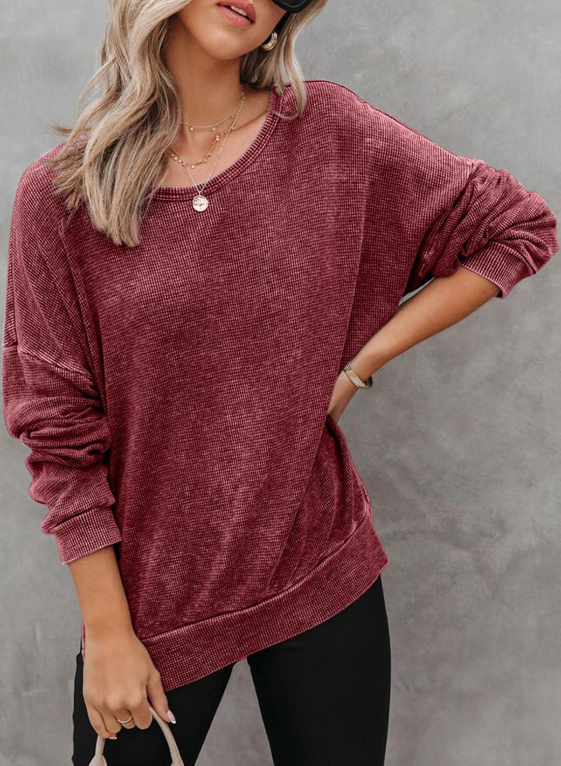 Dokotoo Womens Oversized Waffle Knit Crewneck Sweatshirts Long Sleeve Side Slits Casual Pullover Sweatshirt Tops(Red)