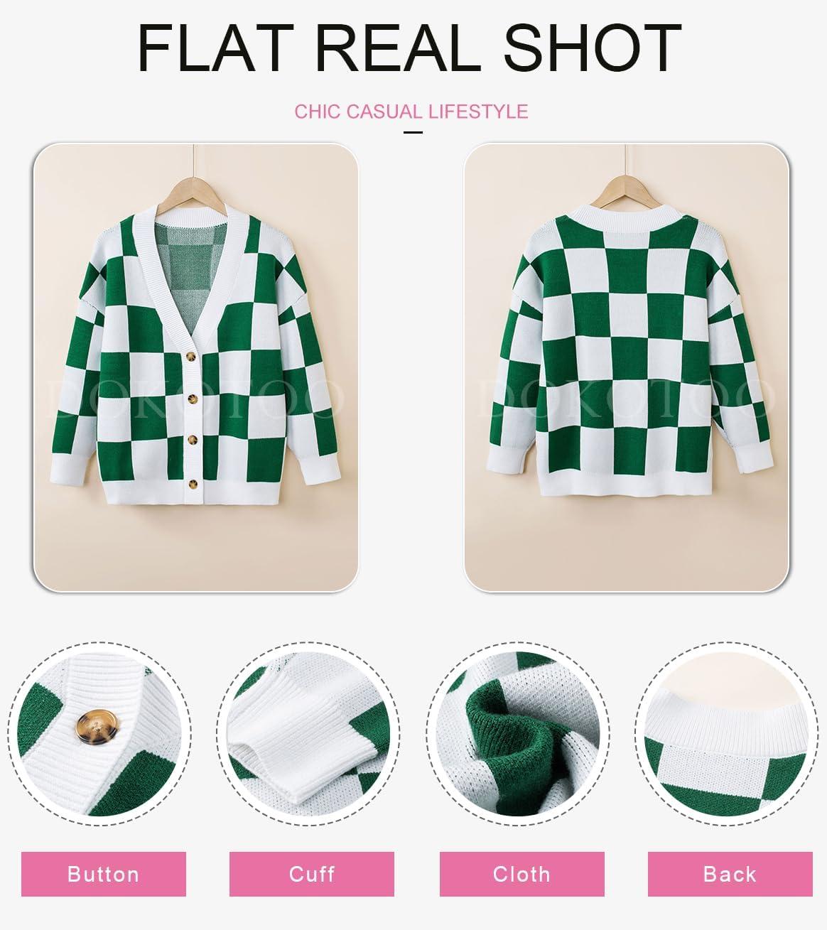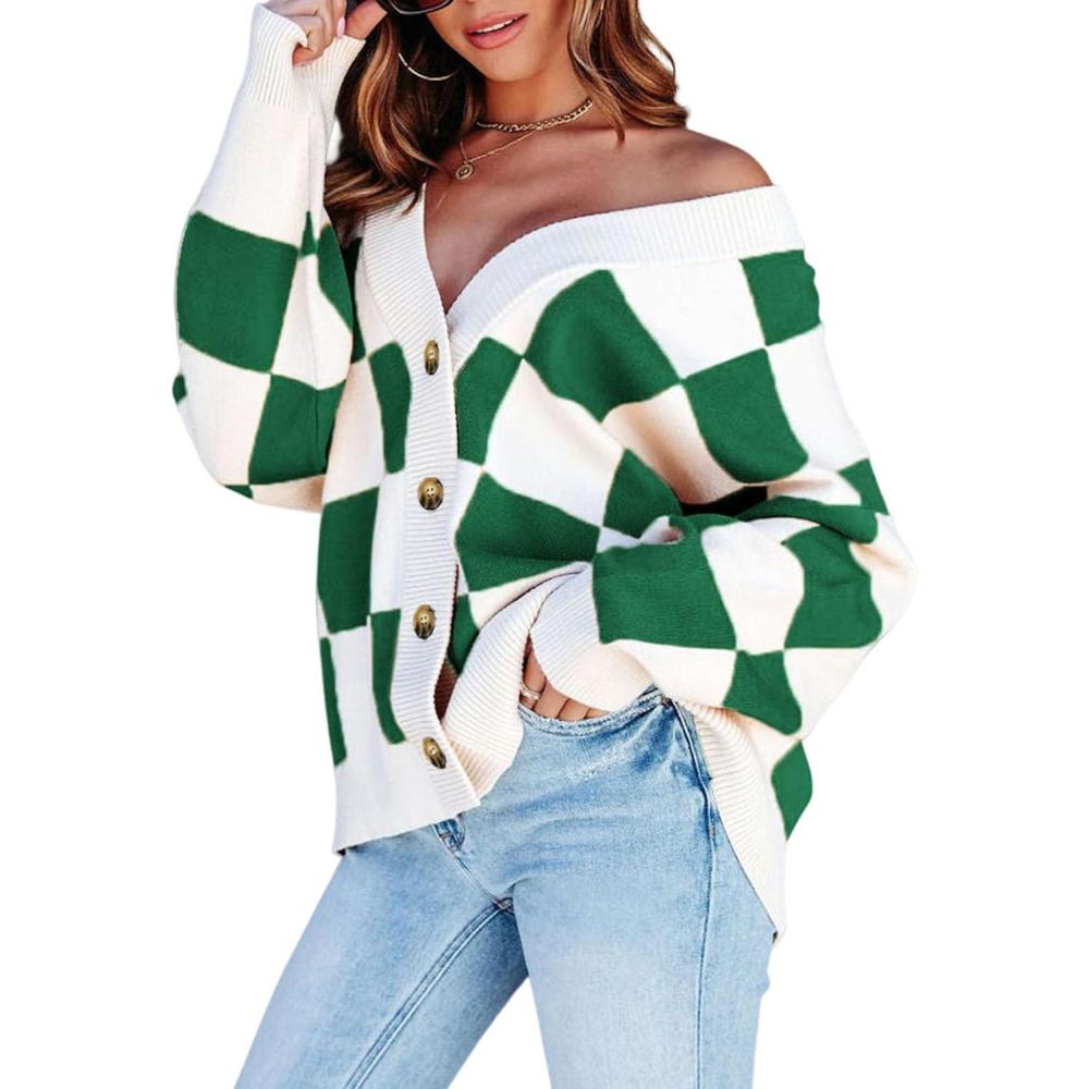 Dokotoo Womens Plaid V Neck Button Down Long Sleeve Cable Knit Oversized Cardigan Sweaters Tops(Green)
