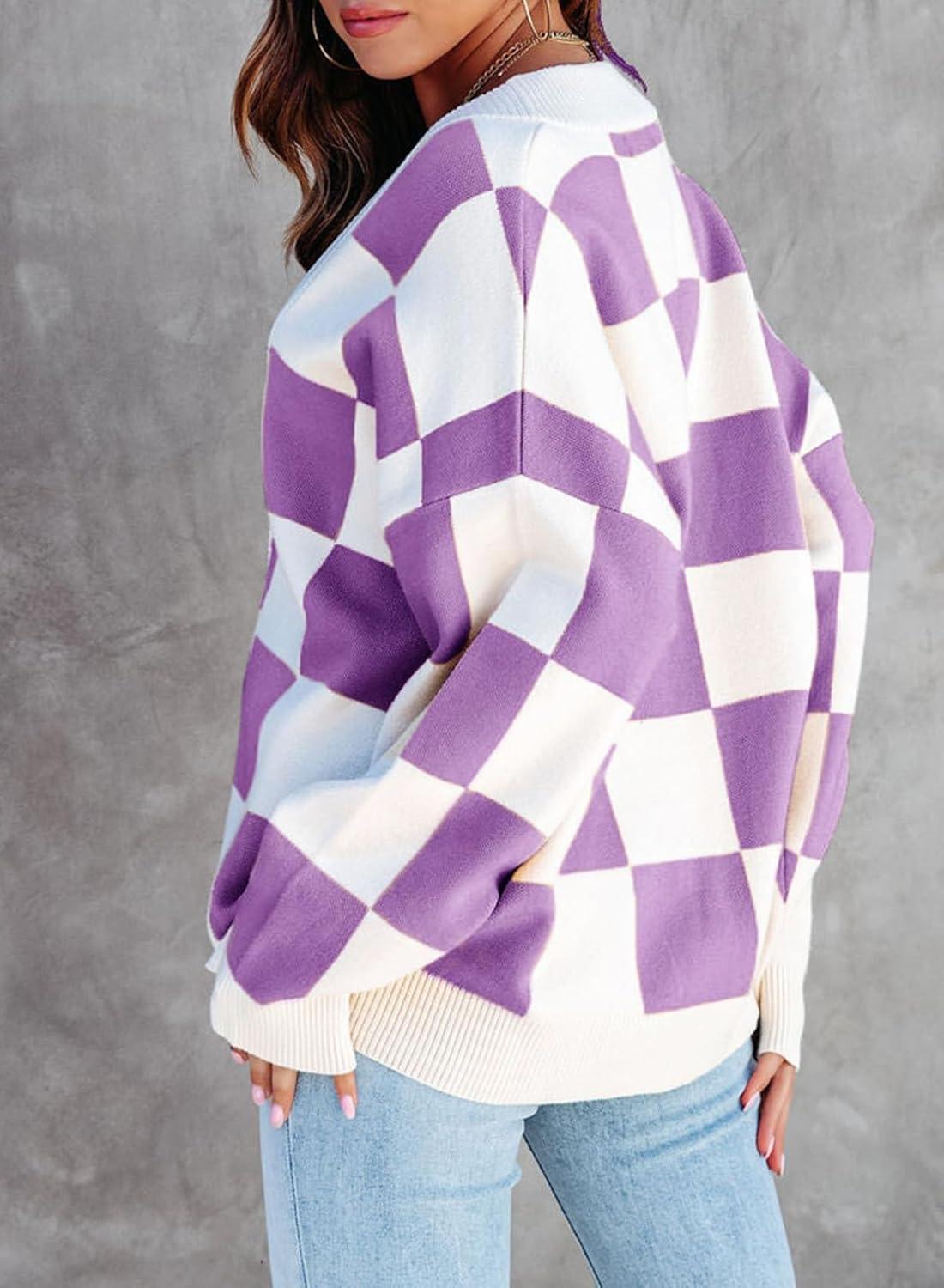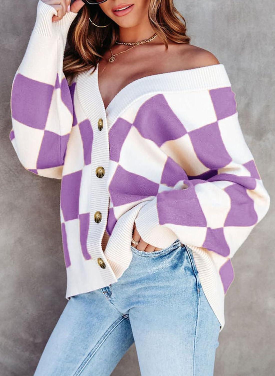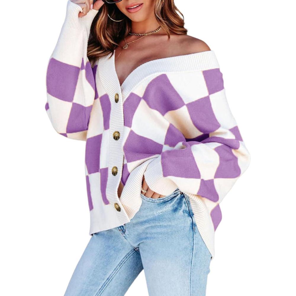 Dokotoo Womens Plaid V Neck Button Down Long Sleeve Cable Knit Oversized Cardigan Sweaters Tops(Purple)