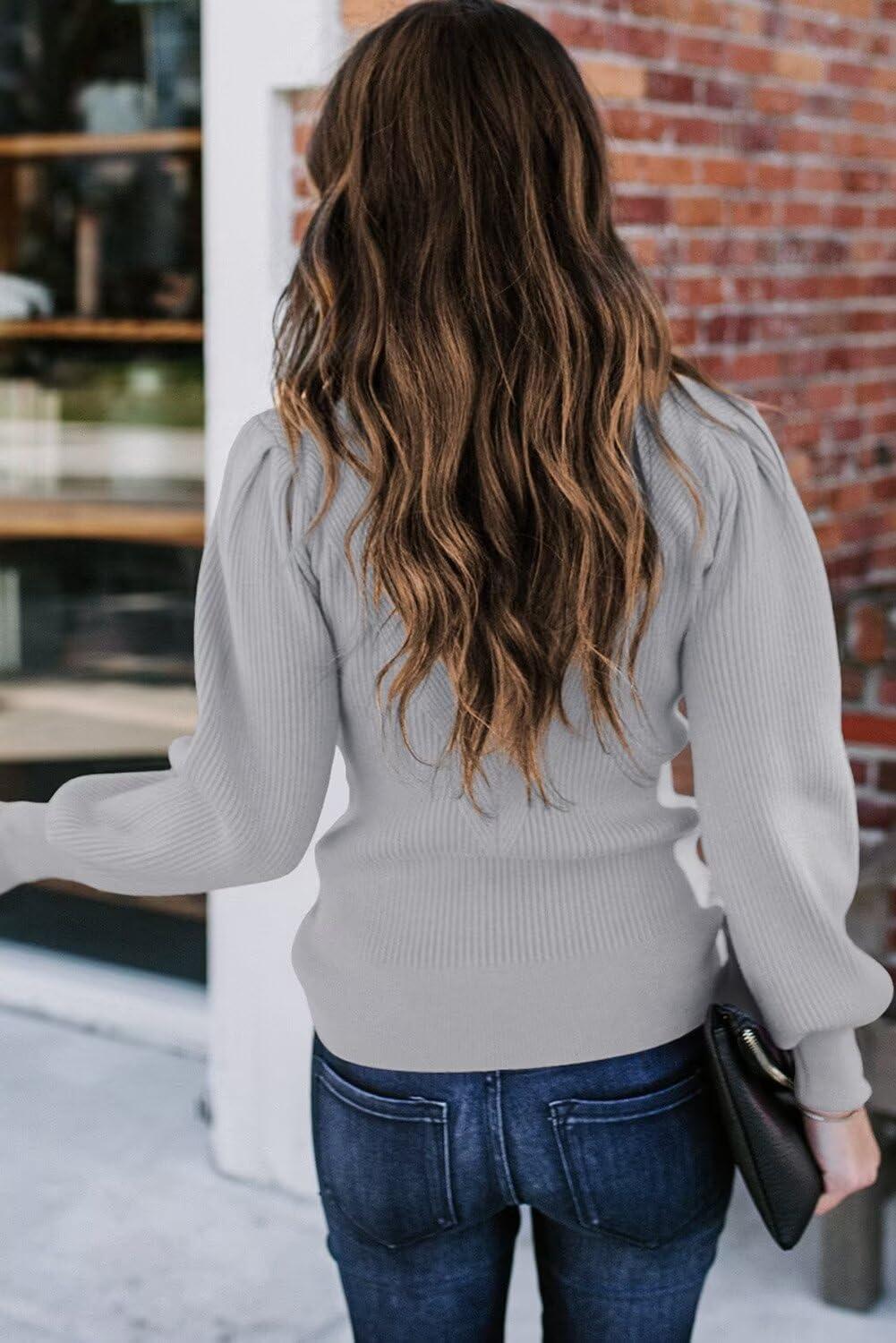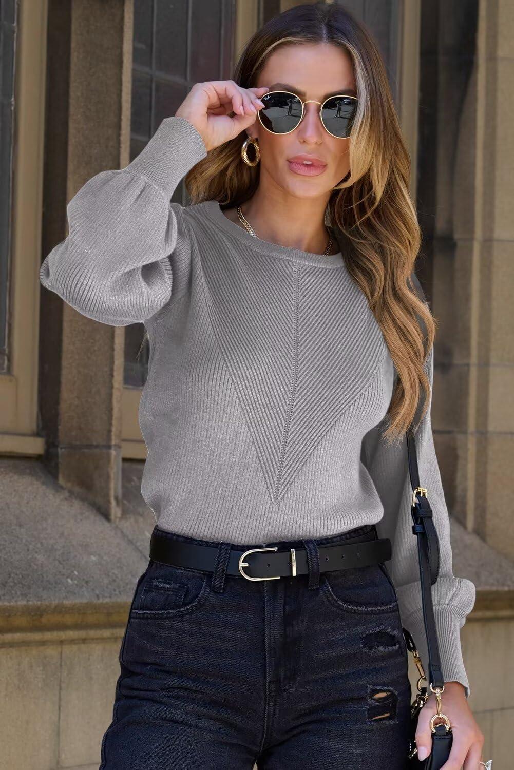 Dokotoo Womens Ribbed Knit Long Lantern Sleeves Sweater Crewneck Casual Slim Fit Pullover Jumper Tops(A Gray)