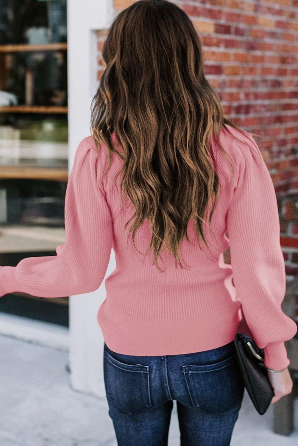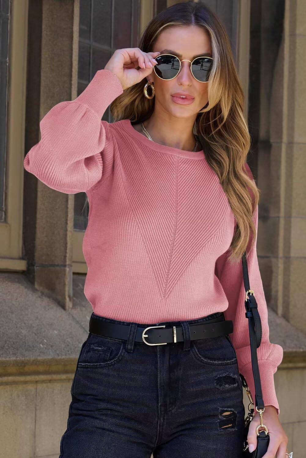 Dokotoo Womens Ribbed Knit Long Lantern Sleeves Sweater Crewneck Casual Slim Fit Pullover Jumper Tops(A Light Pink)