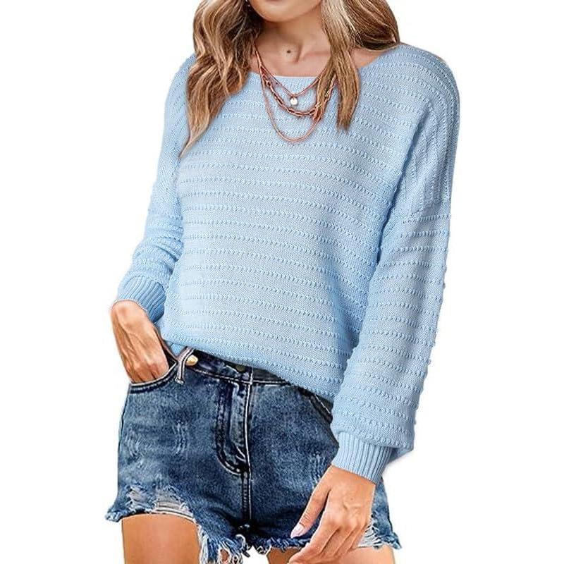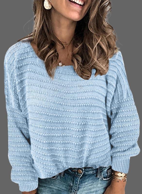Dokotoo Womens Ribbed Knit Textured Drop Shoulder Long Sleeve Crew Neck Pullover Sweaters(Sky Blue)