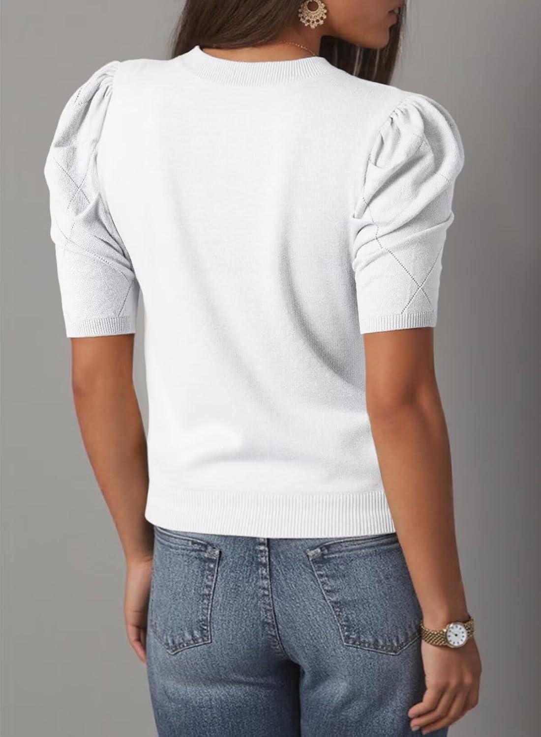 Dokotoo Women’s Short Puff Sleeve Knit Tops 2025 Round Neck Sweaters Crochet Tops for Women(White)
