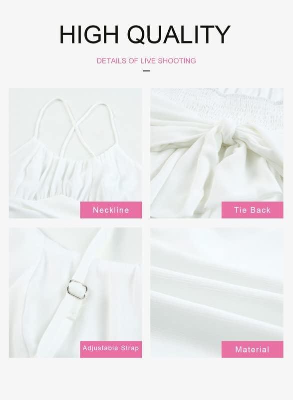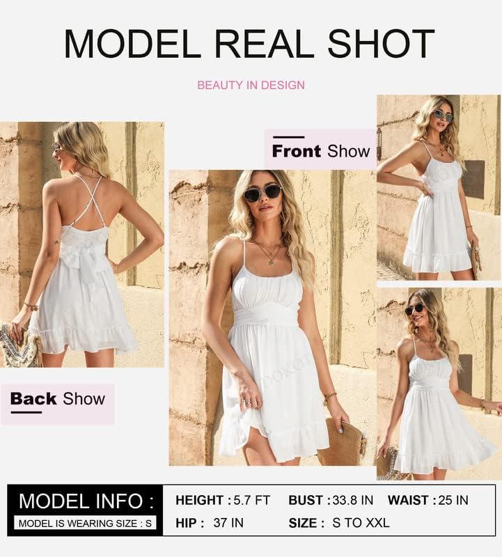 Dokotoo Women’s Spaghetti Strap Dresses Scoop Neck Bow Backless Sleeveless Elastic Waist Ruffle Hem A-Line Casual Mini Dress(A White)