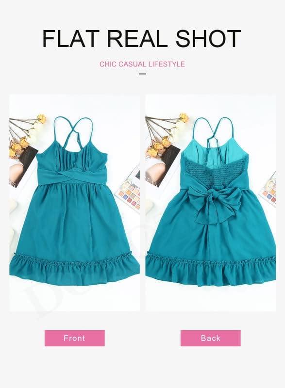 Dokotoo Women’s Spaghetti Strap Dresses Scoop Neck Bow Backless Sleeveless Elastic Waist Ruffle Hem A-Line Casual Mini Dress(Dark Green)