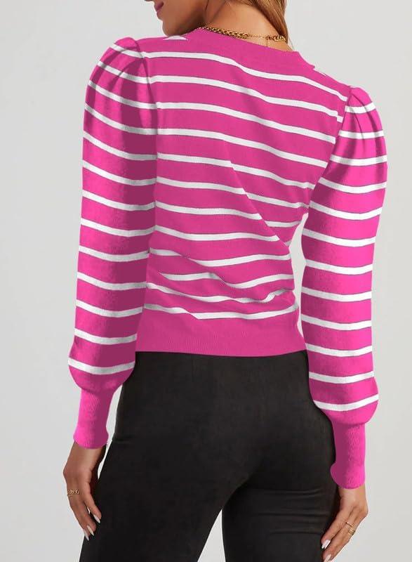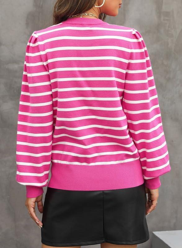Dokotoo Women’s Striped Sweaters Puff Long Sleeve Crewneck Ribbed Knit Pullover Jumper Tops(Pink Stripe)
