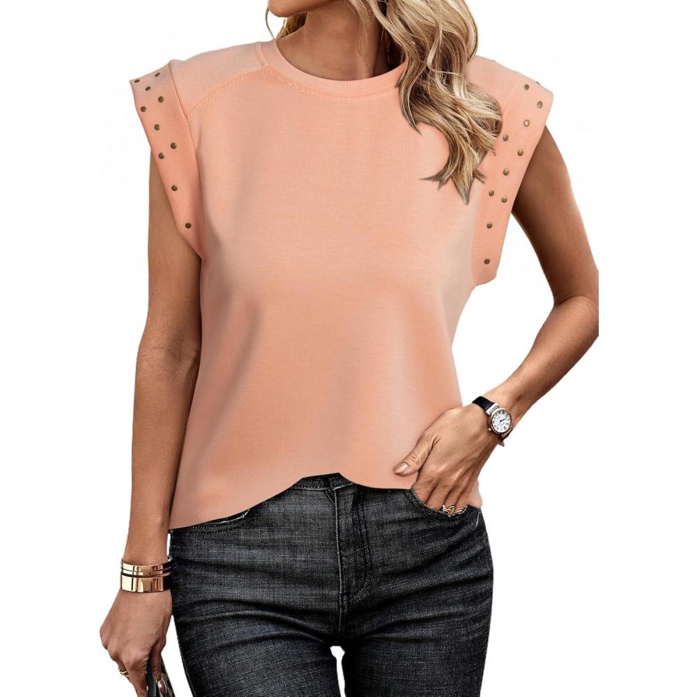 Dokotoo Womens Studded Short Sleeve Tops Summer Casual Knit Solid Crew Neck Shirts Blouses(Pink)
