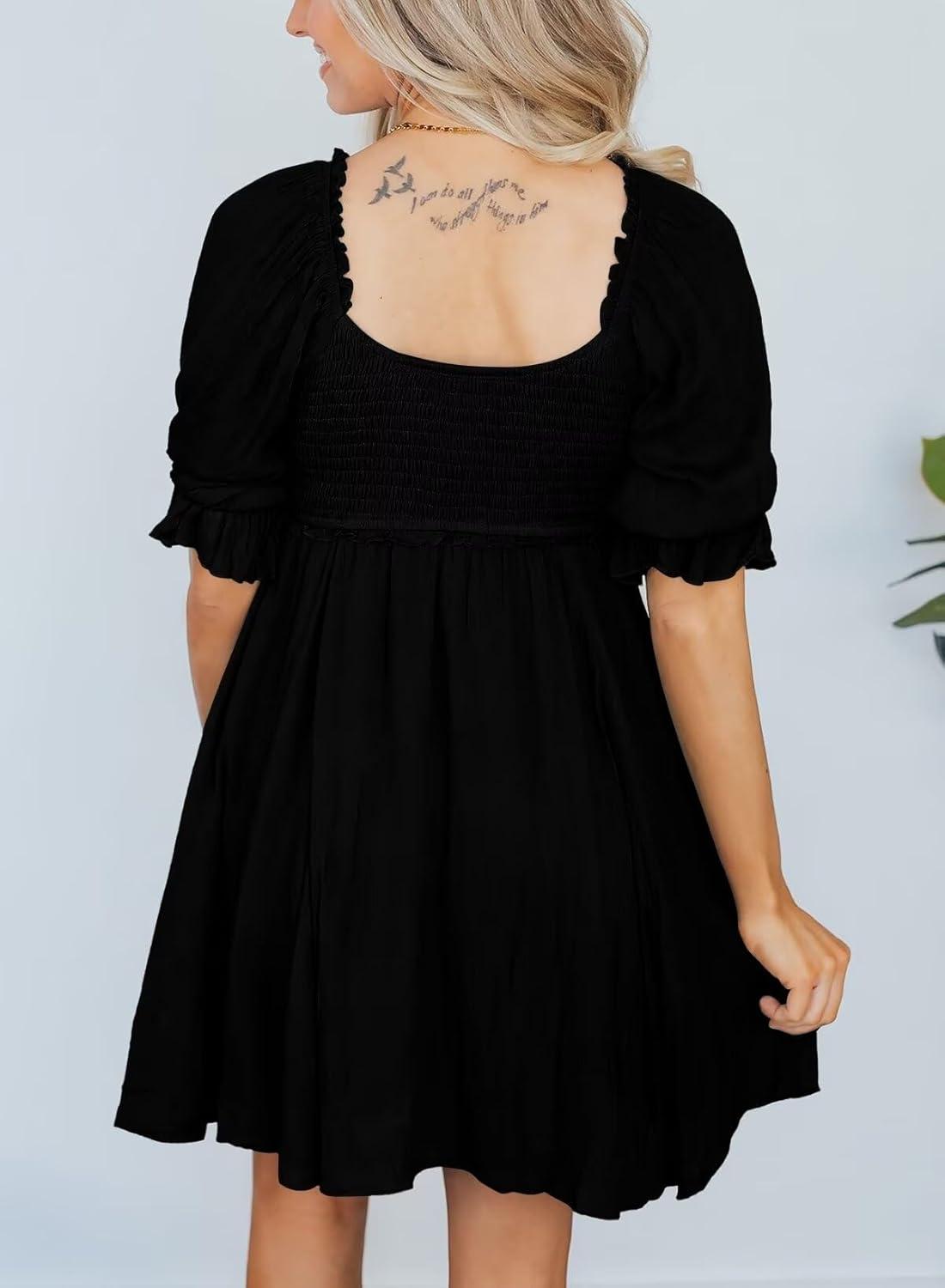 Dokotoo Womens Summer Dresses 2025 Short Sleeve Square Neck Smocked Elastic Waist Ruffle Tiered Casual Swing Mini Dress(Black)