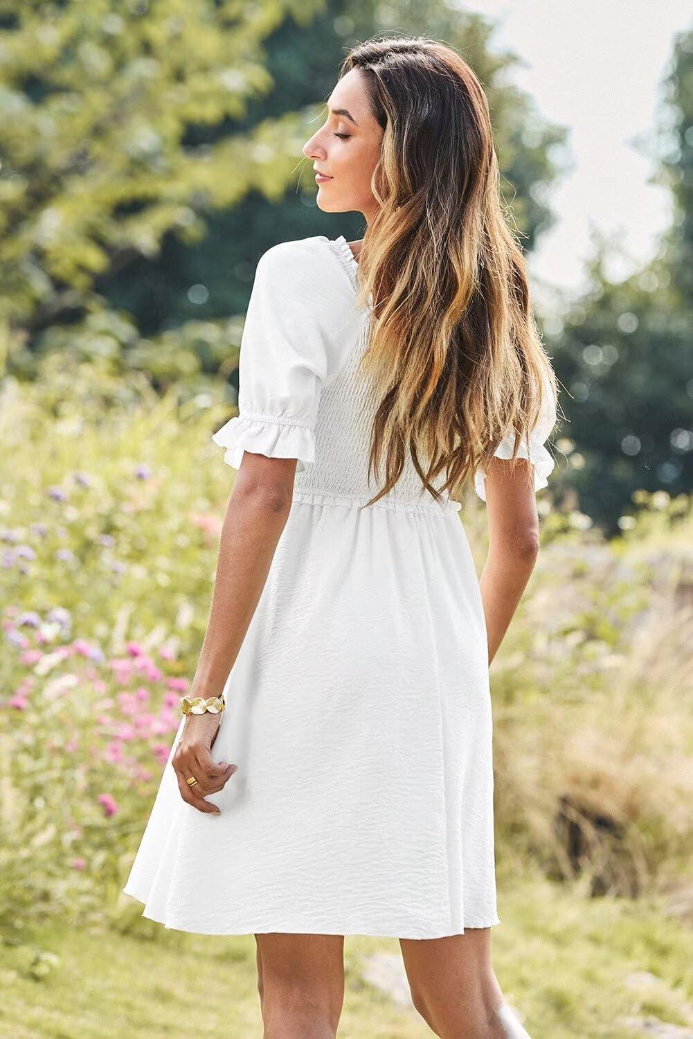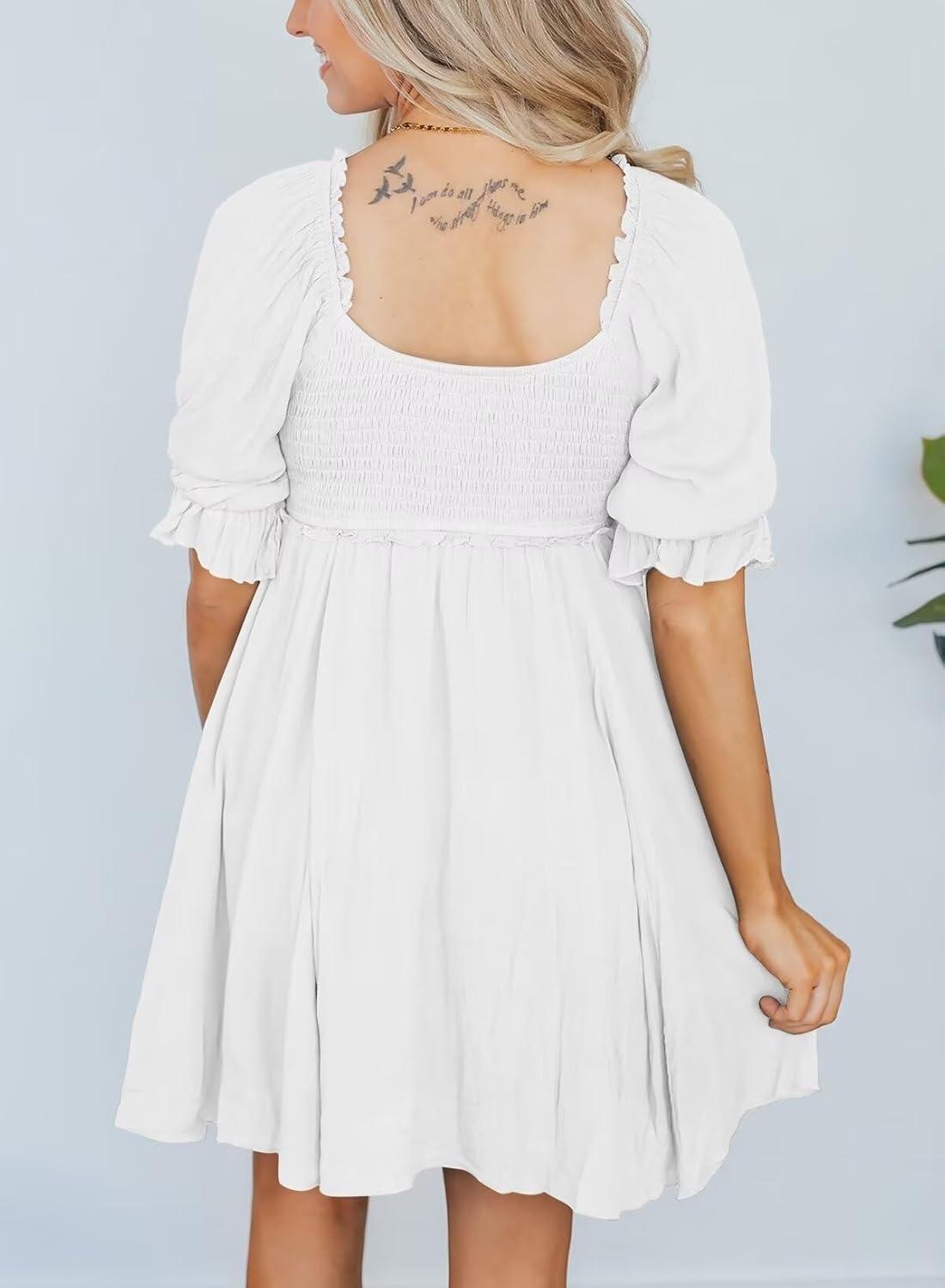 Dokotoo Womens Summer Dresses 2025 Short Sleeve Square Neck Smocked Elastic Waist Ruffle Tiered Casual Swing Mini Dress(White)