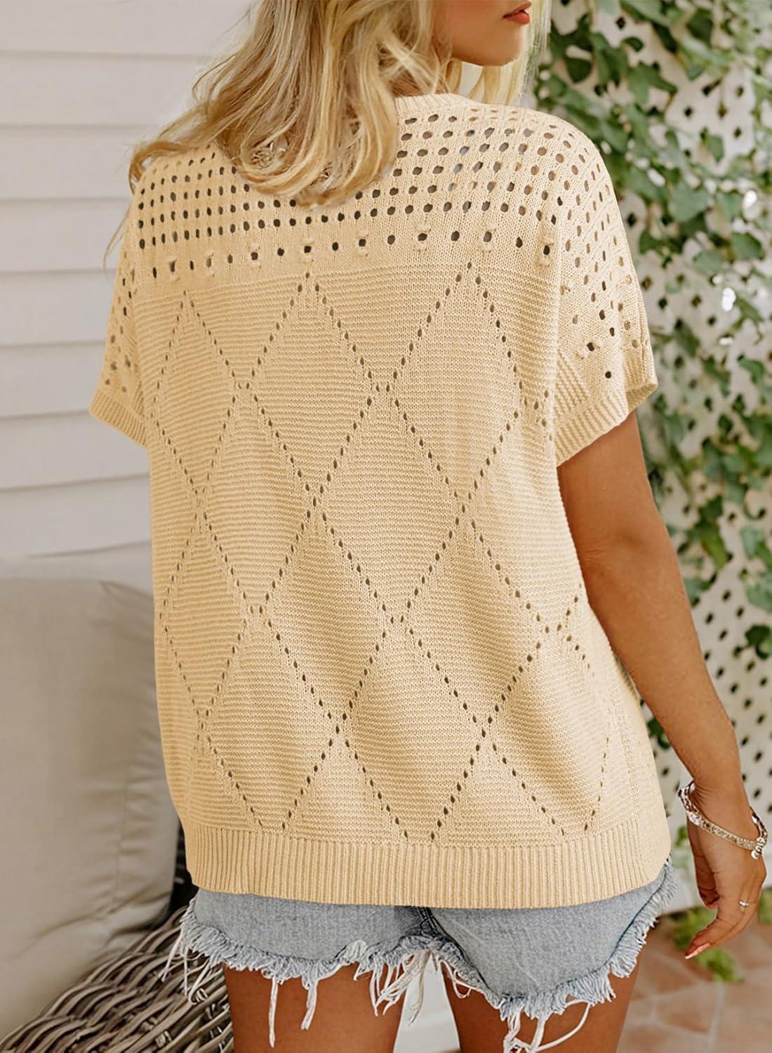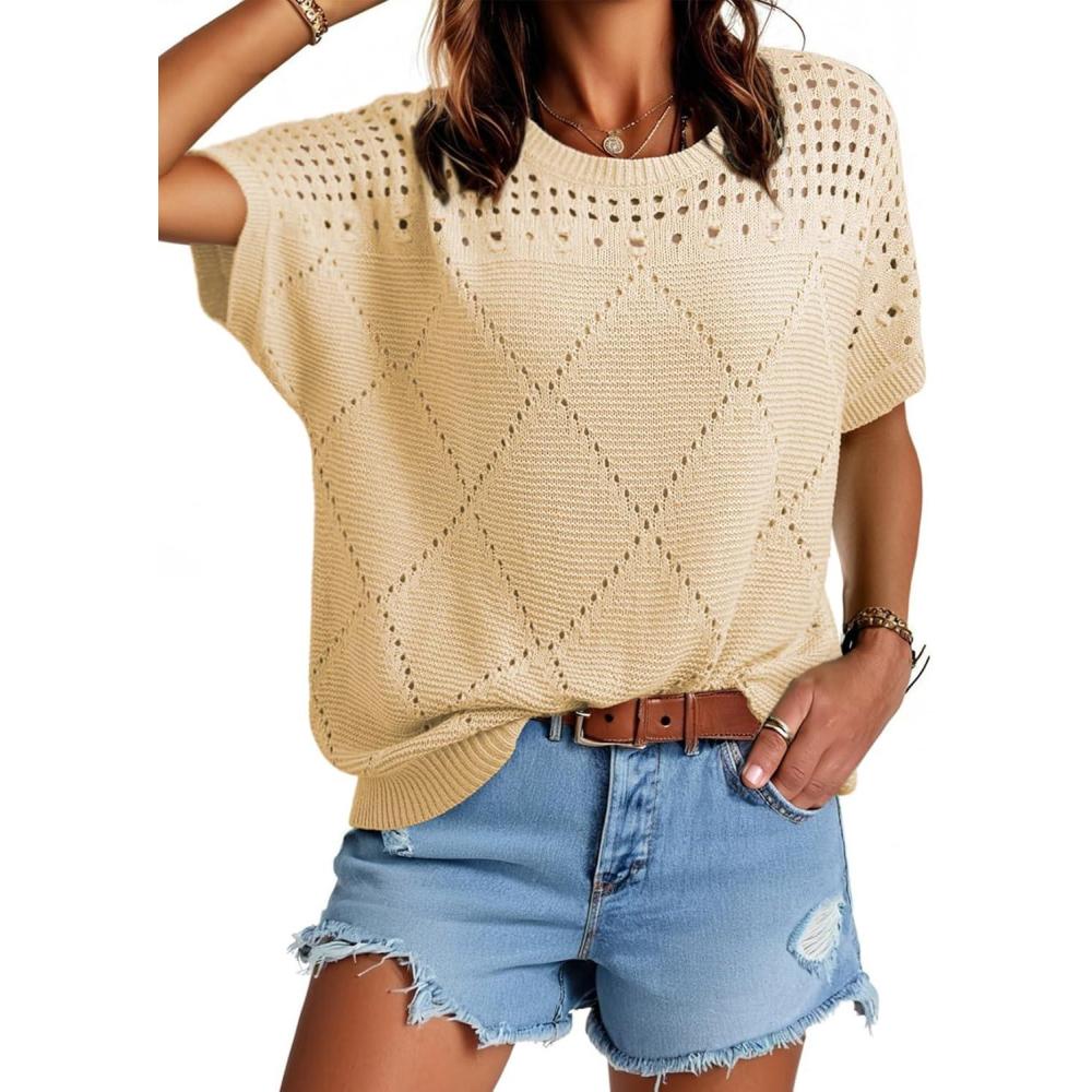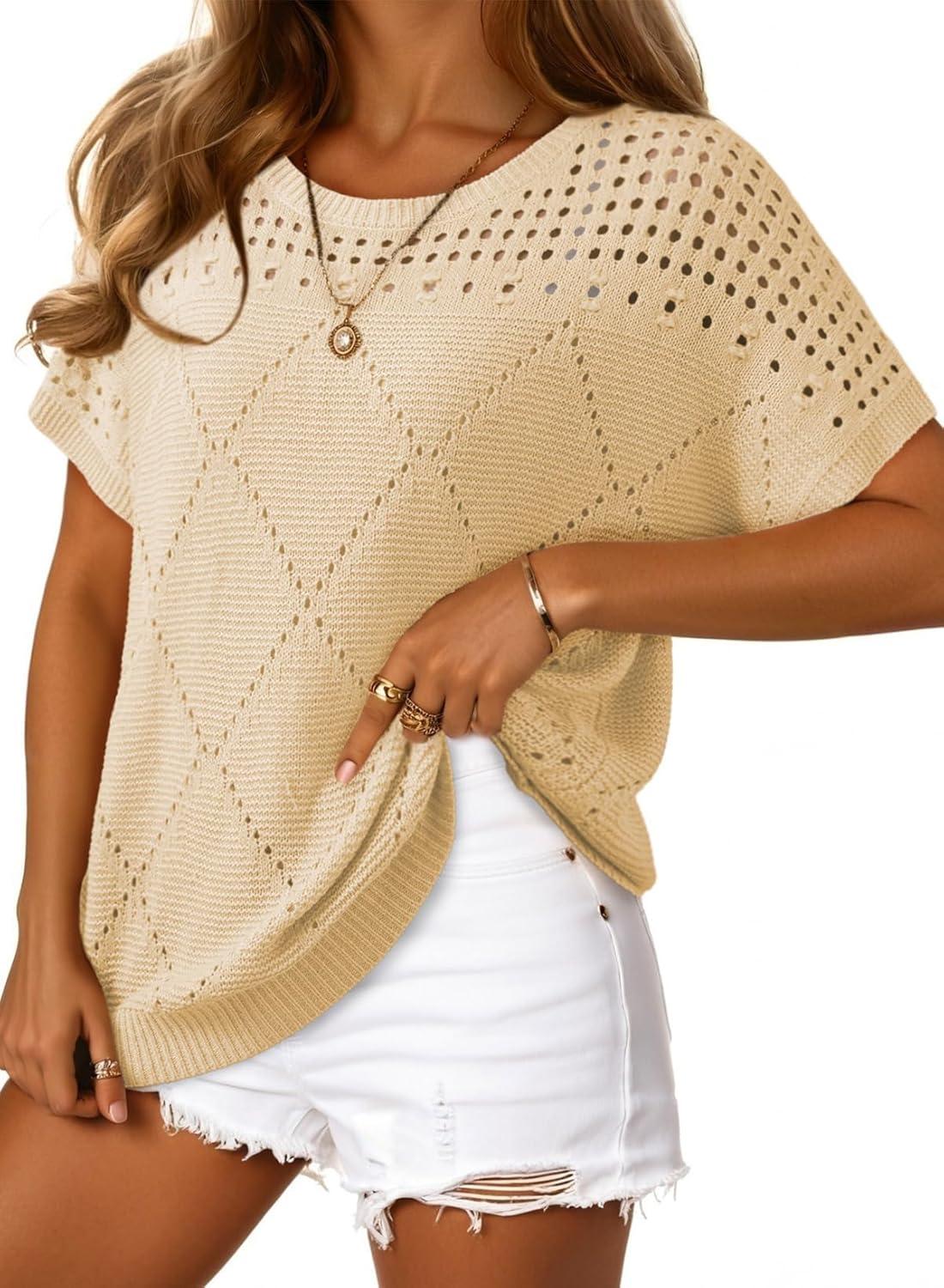 Dokotoo Women’s Summer Scoop Neck Short Sleeve Sweaters Crochet Hollow Out Knit Tops Pullover Shirts Beach Cover Up(Apricot)