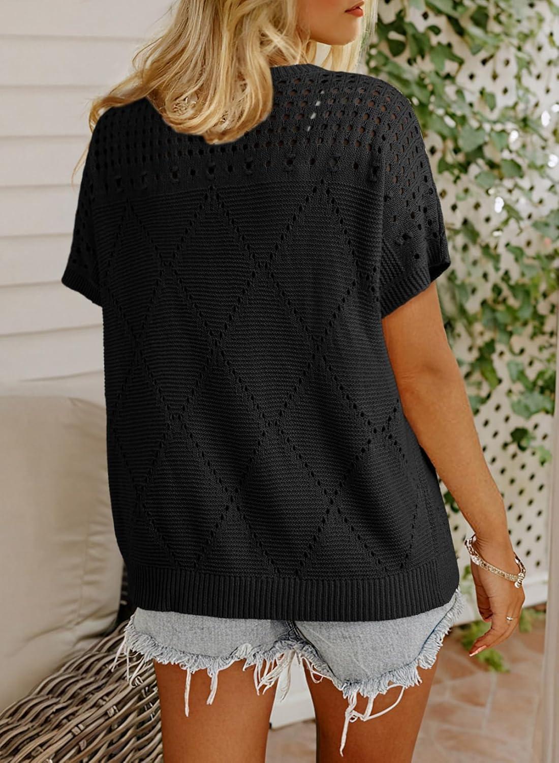 Dokotoo Women’s Summer Scoop Neck Short Sleeve Sweaters Crochet Hollow Out Knit Tops Pullover Shirts Beach Cover Up(Black)