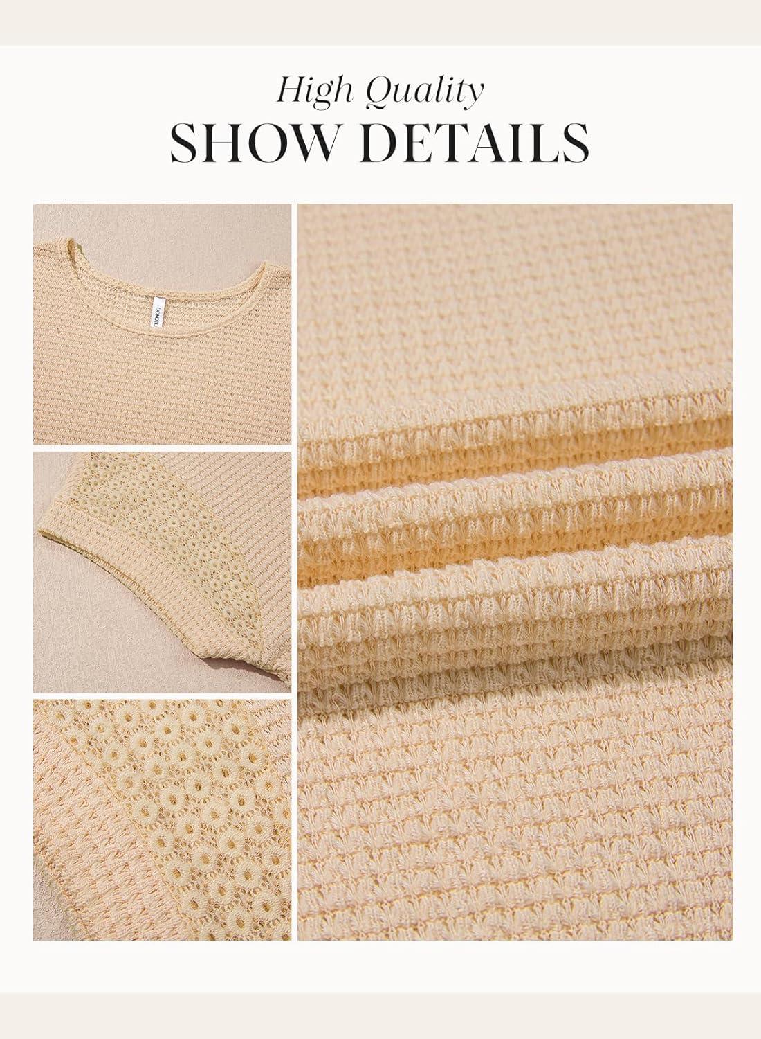Dokotoo Womens Summer Tops 2026 Waffle Knit Lace Hollow Out Short Sleeve T-Shirts Crewneck Casual Loose Basic Tee Blouses(Apricot)