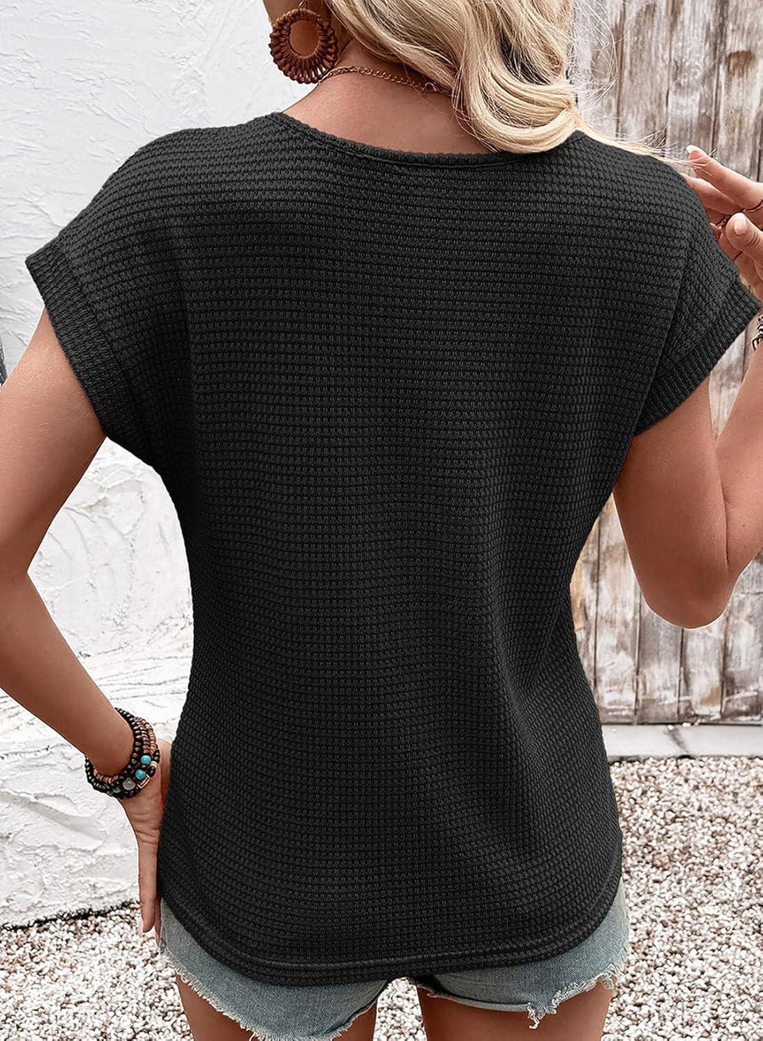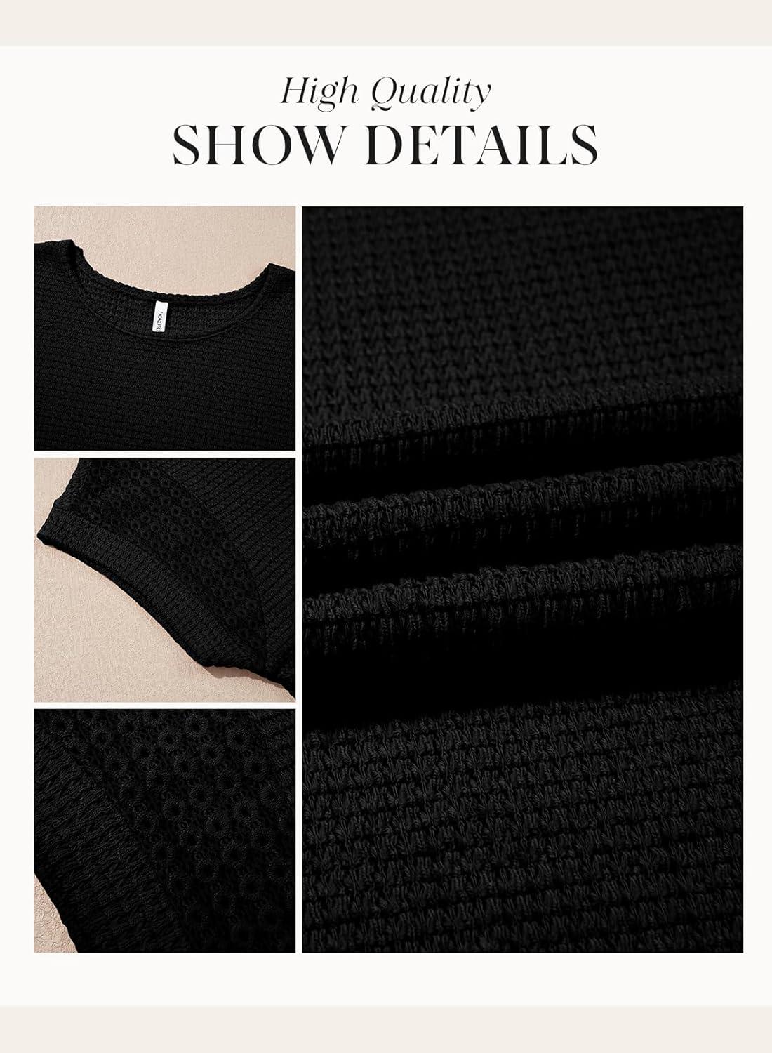 Dokotoo Womens Summer Tops 2026 Waffle Knit Lace Hollow Out Short Sleeve T-Shirts Crewneck Casual Loose Basic Tee Blouses(Black)