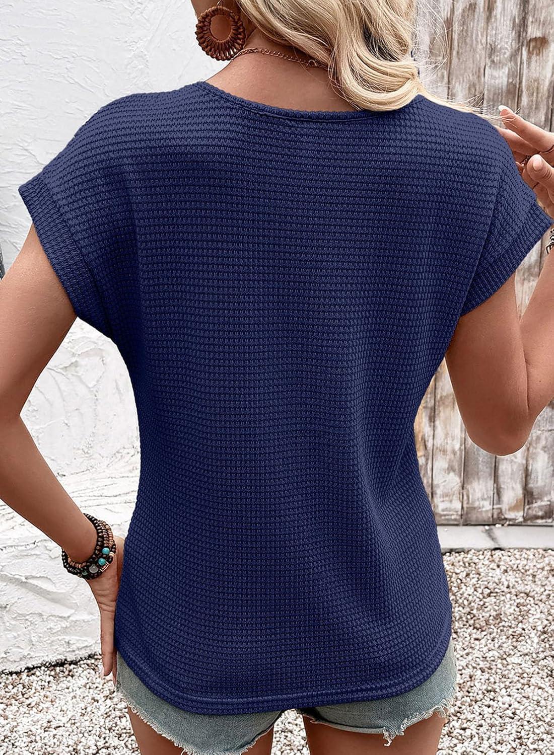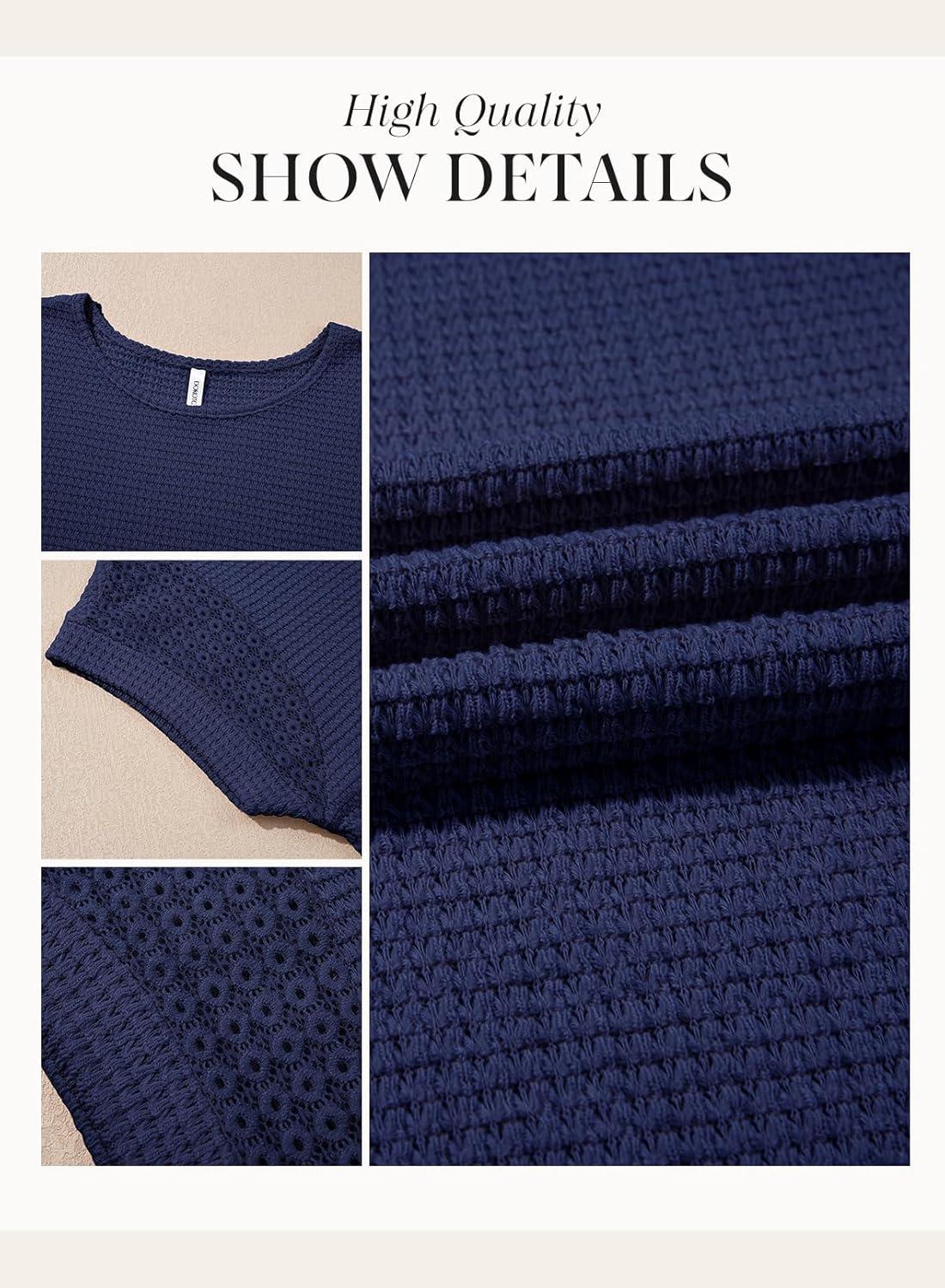 Dokotoo Womens Summer Tops 2026 Waffle Knit Lace Hollow Out Short Sleeve T-Shirts Crewneck Casual Loose Basic Tee Blouses(Navy Blue)