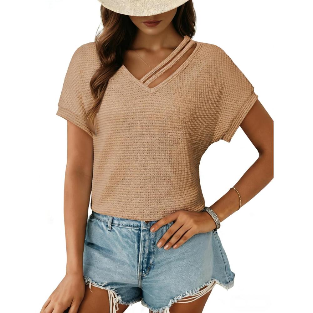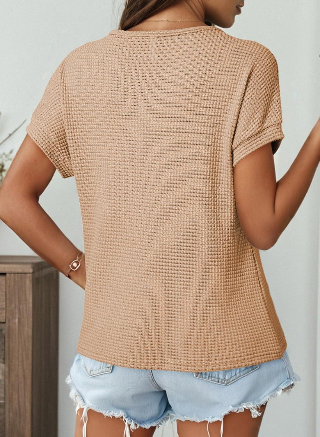 Dokotoo Womens Summer Tops 2026 Waffle Knit Short Sleeve V Neck Shirts Women’s Blouses Dressy Casual Basic Tee(A Apricot)