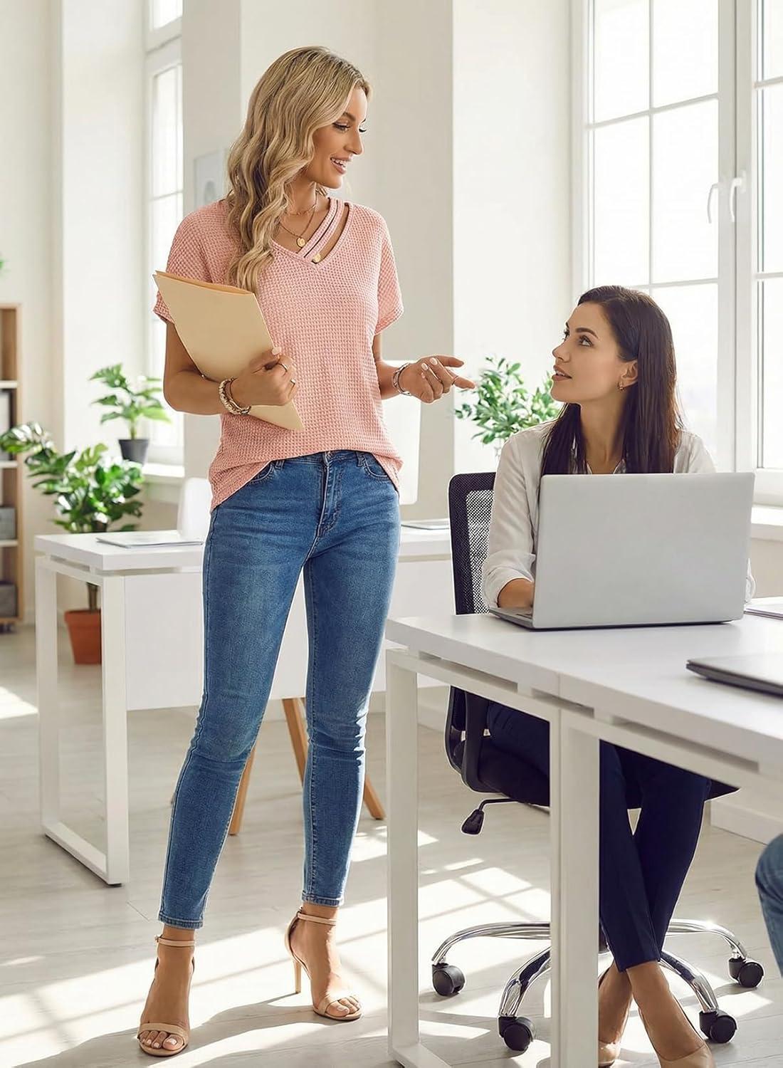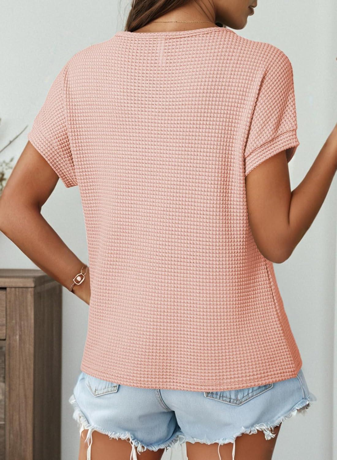 Dokotoo Womens Summer Tops 2026 Waffle Knit Short Sleeve V Neck Shirts Women’s Blouses Dressy Casual Basic Tee(A Gossamer Pink)