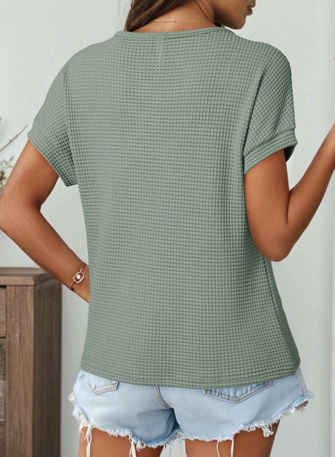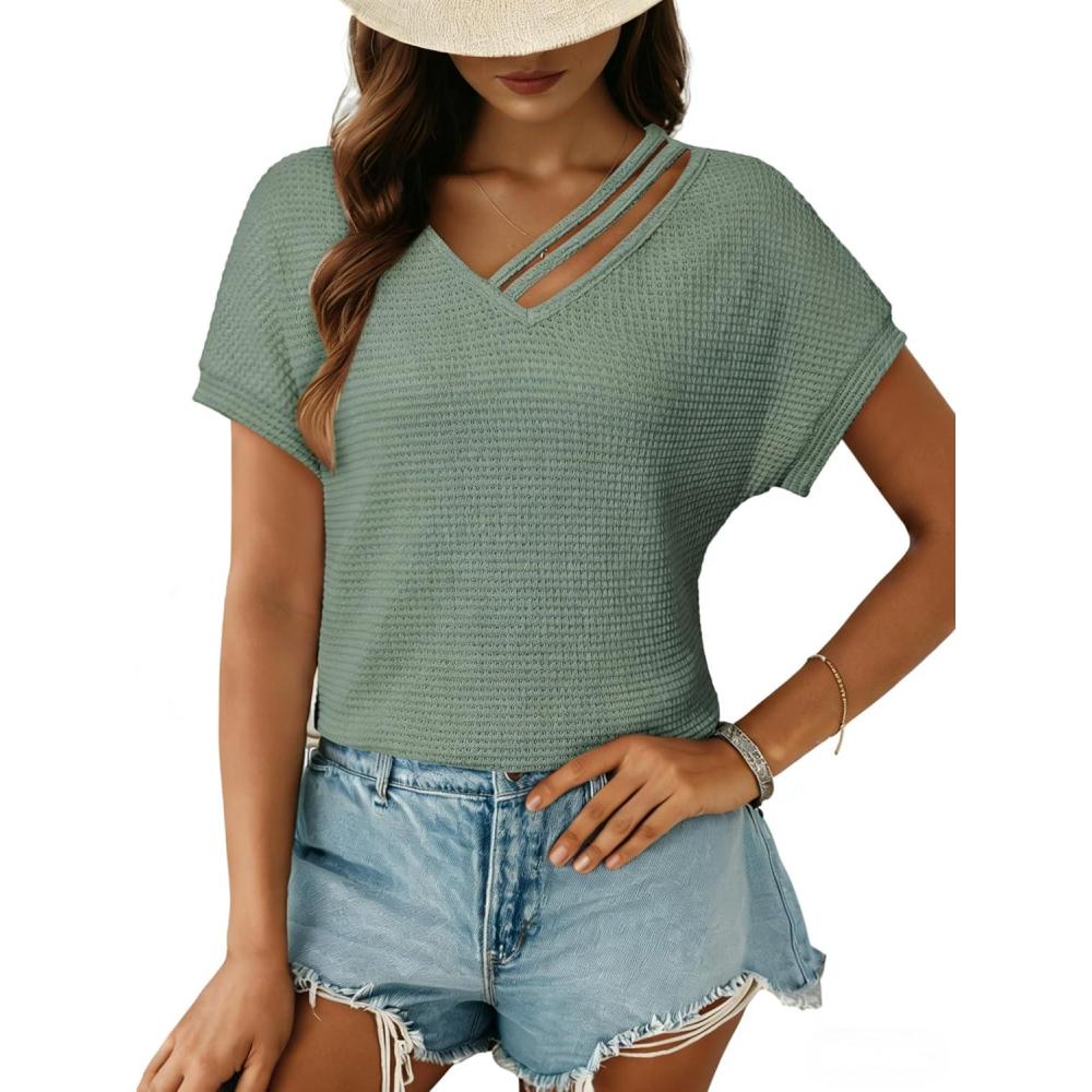 Dokotoo Womens Summer Tops 2026 Waffle Knit Short Sleeve V Neck Shirts Women’s Blouses Dressy Casual Basic Tee(A Green Bay)
