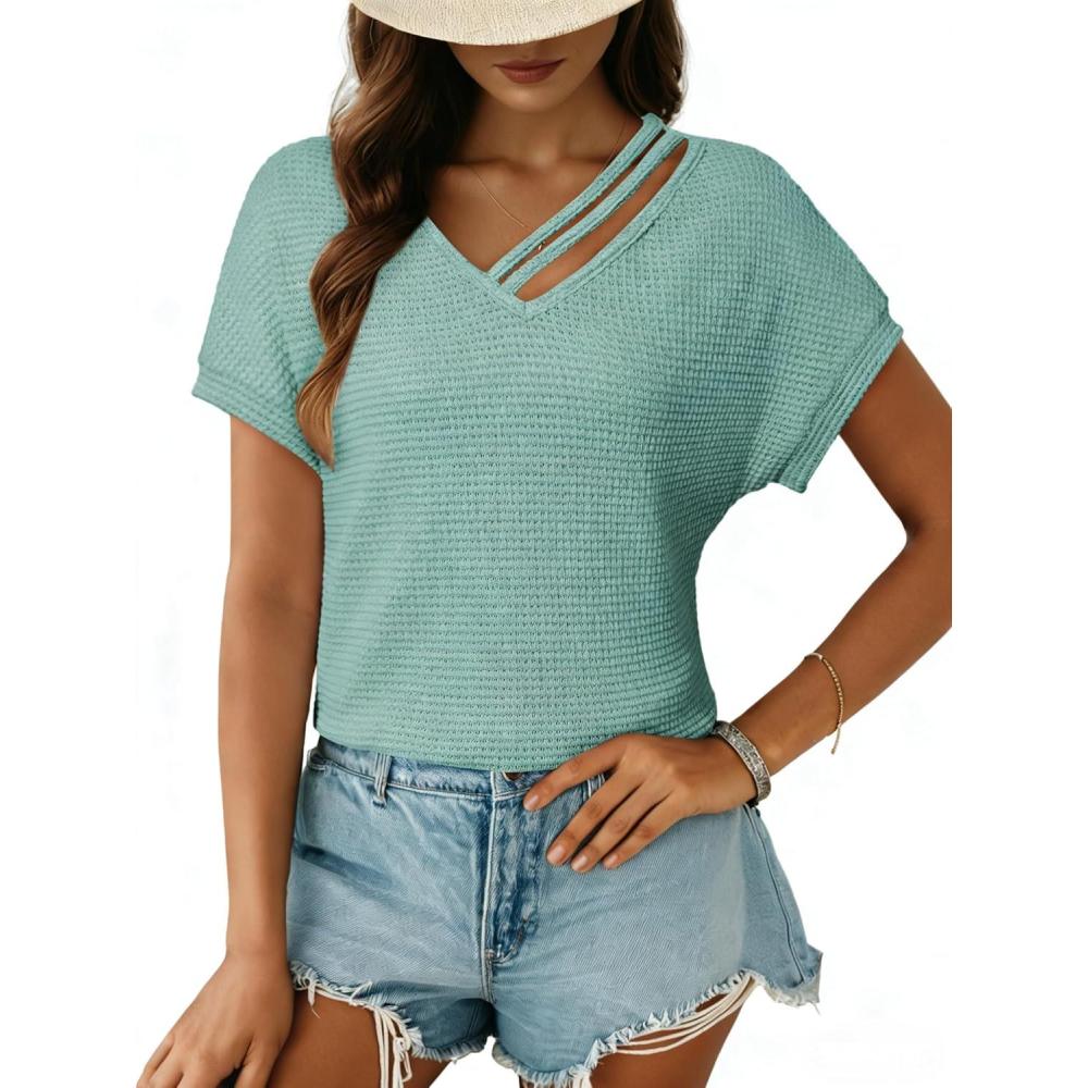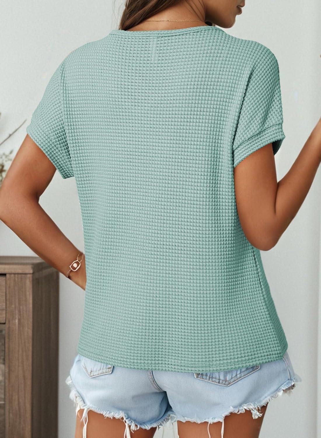 Dokotoo Womens Summer Tops 2026 Waffle Knit Short Sleeve V Neck Shirts Women’s Blouses Dressy Casual Basic Tee(A Green Bay)