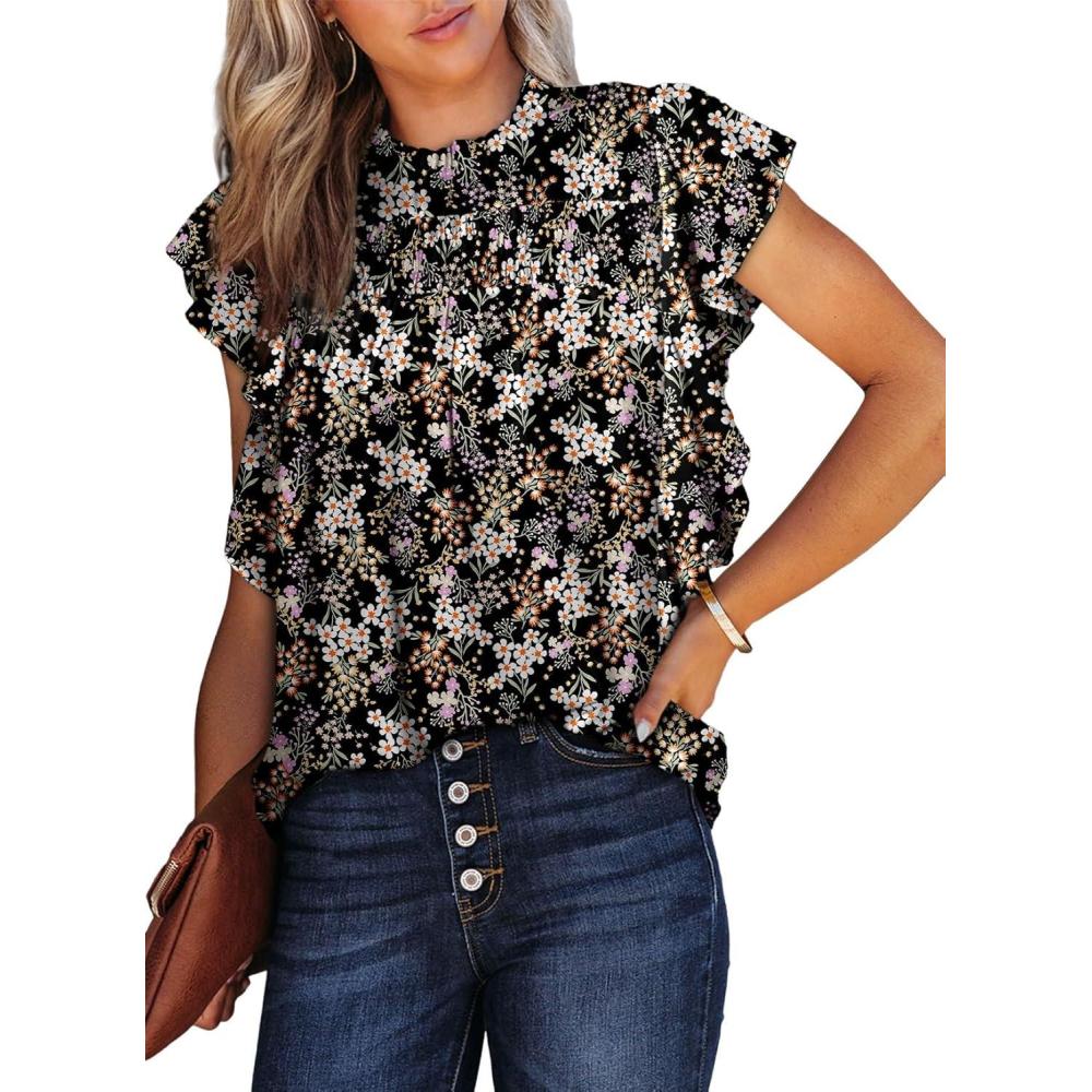 Dokotoo Womens Summer Tops Casual Crewneck Floral Print Shirts Smocked Ruffle Short Sleeve Babydoll Blouses(Black)