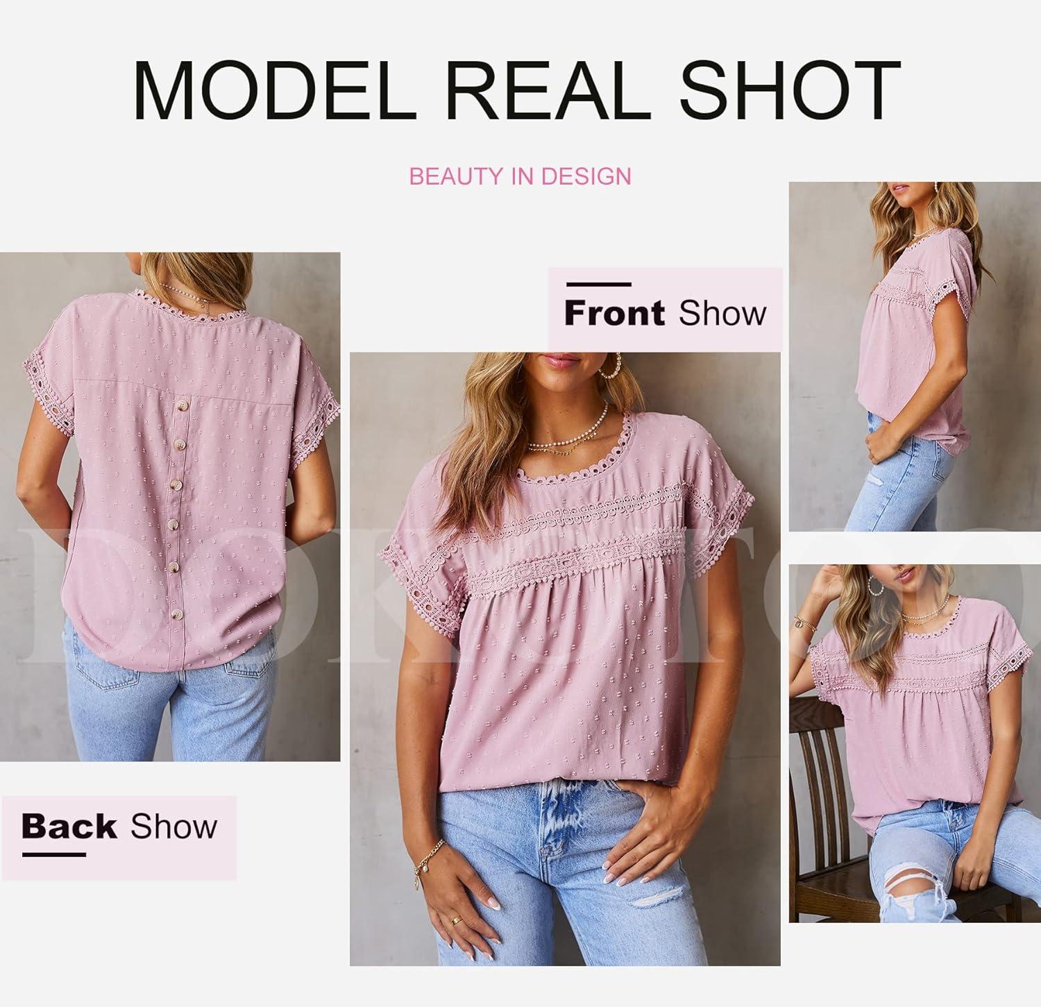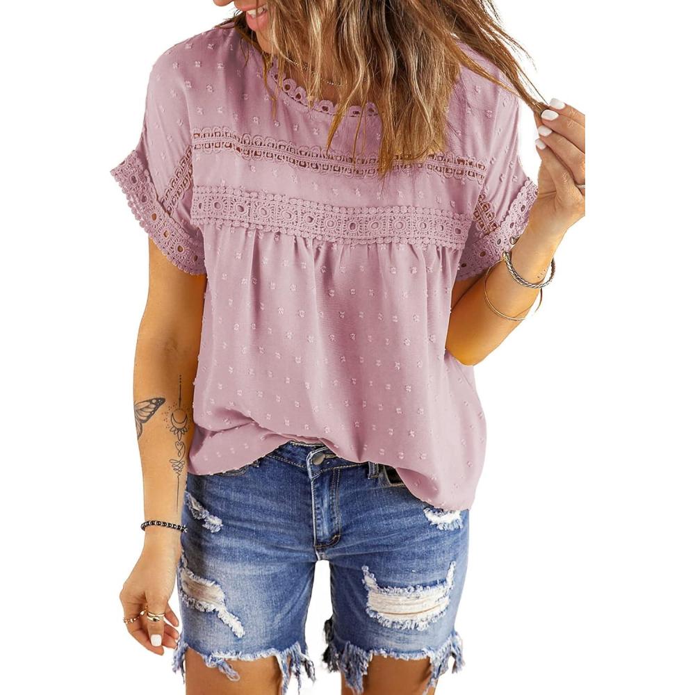 Get the Dokotoo Womens Summer Tops Crewneck Lace Crochet Short Sleeve Shirts Casual Chiffon Blouses(1 Pink) you want at a discounted price during our markdown sale event.