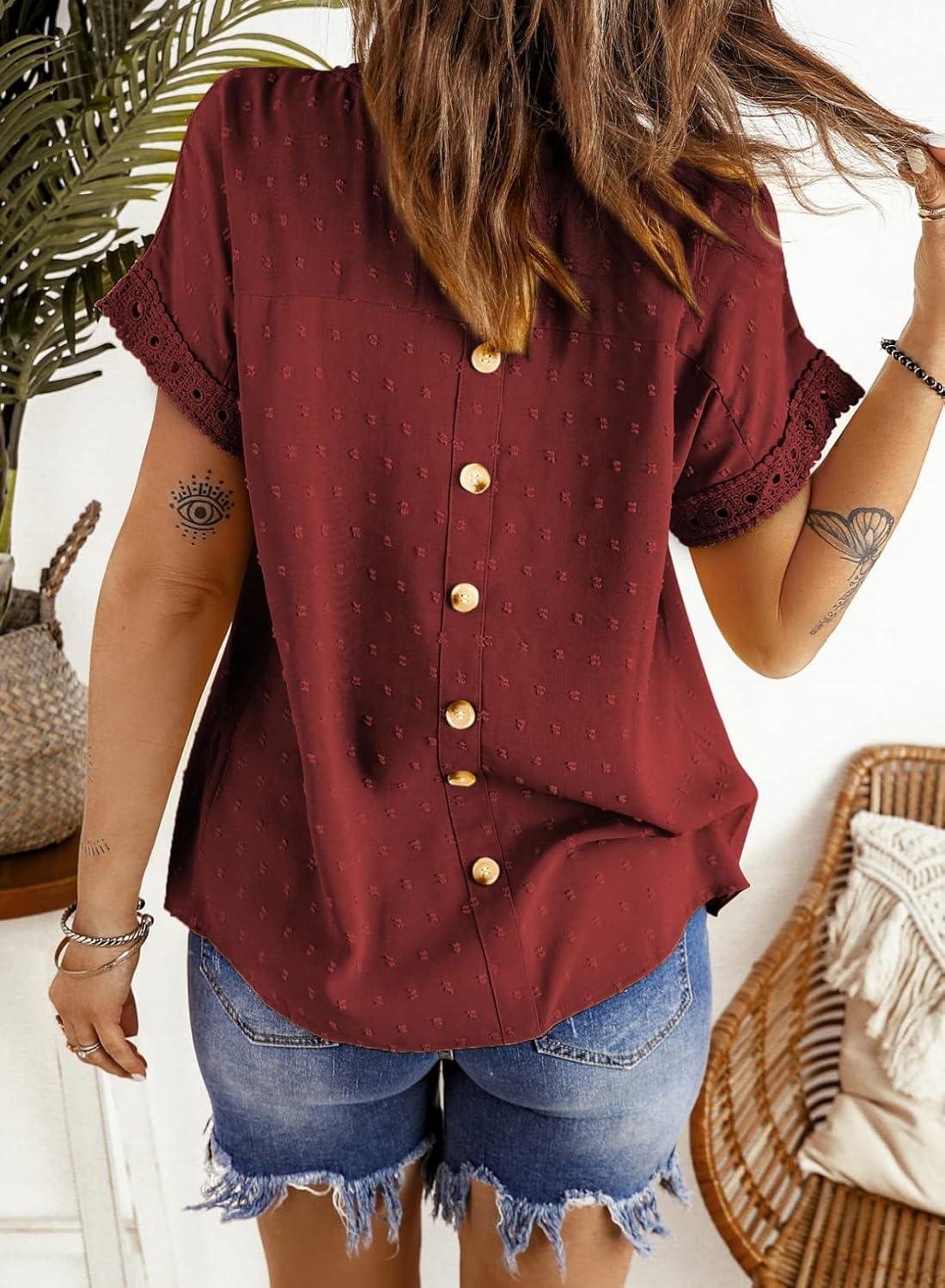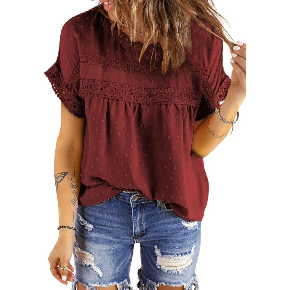 Dokotoo Womens Summer Tops Crewneck Lace Crochet Short Sleeve Shirts Casual Chiffon Blouses(1 Red)
