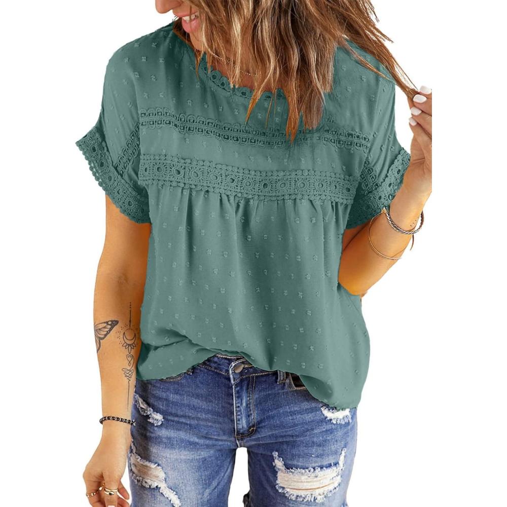 Dokotoo Womens Summer Tops Crewneck Lace Crochet Short Sleeve Shirts Casual Chiffon Blouses(1 Sea Blue)