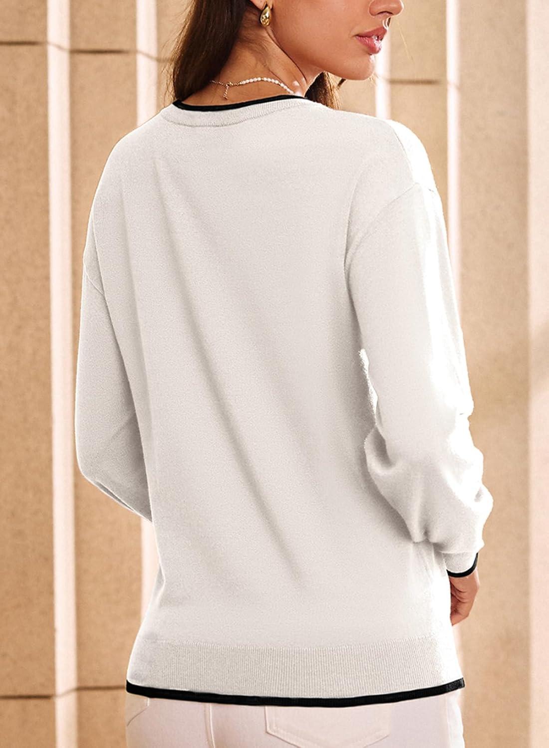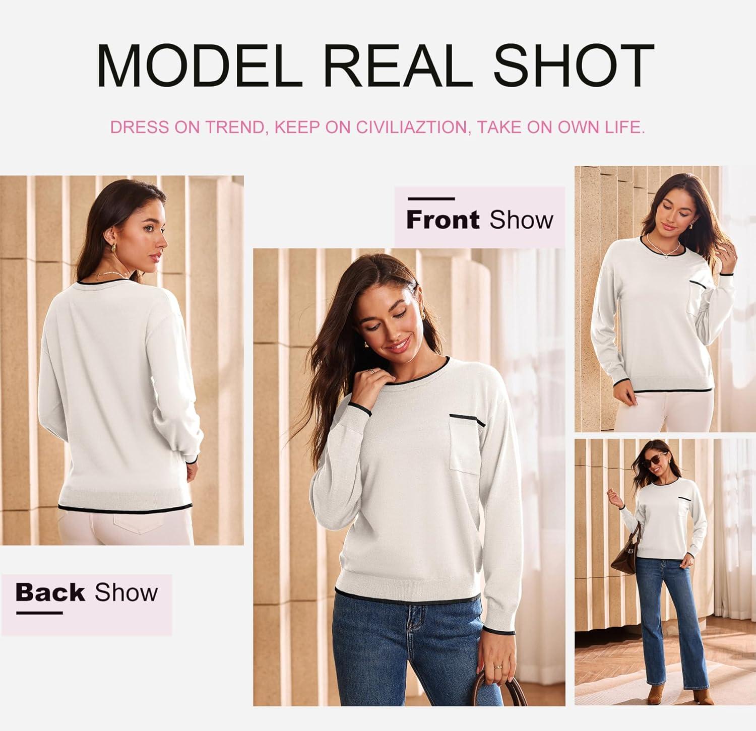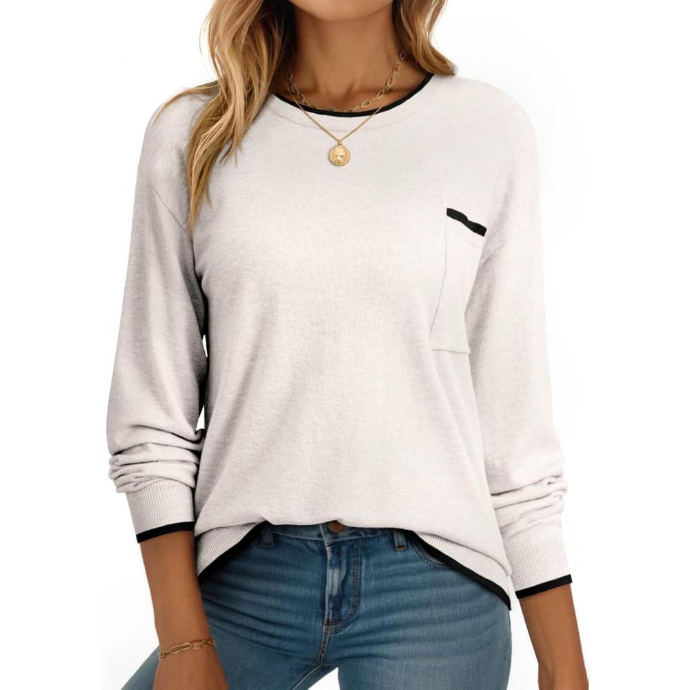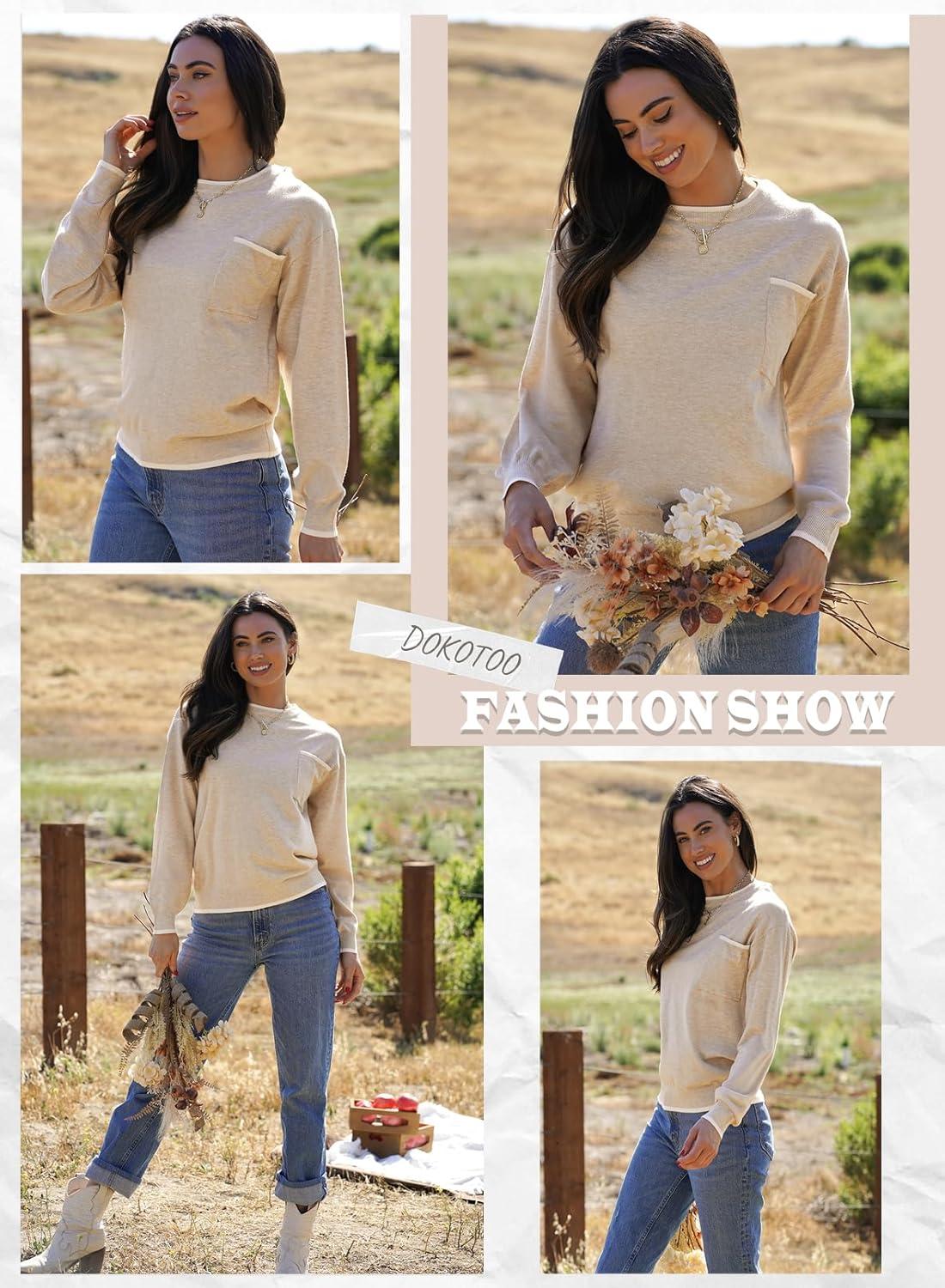 Dokotoo Womens Sweaters Casual Crewneck Long Sleeve Pullover Sweater Jumper Tops with Chest Pocket(White)