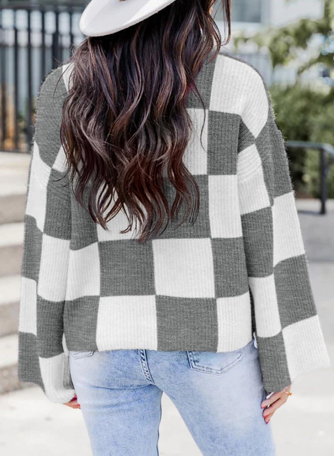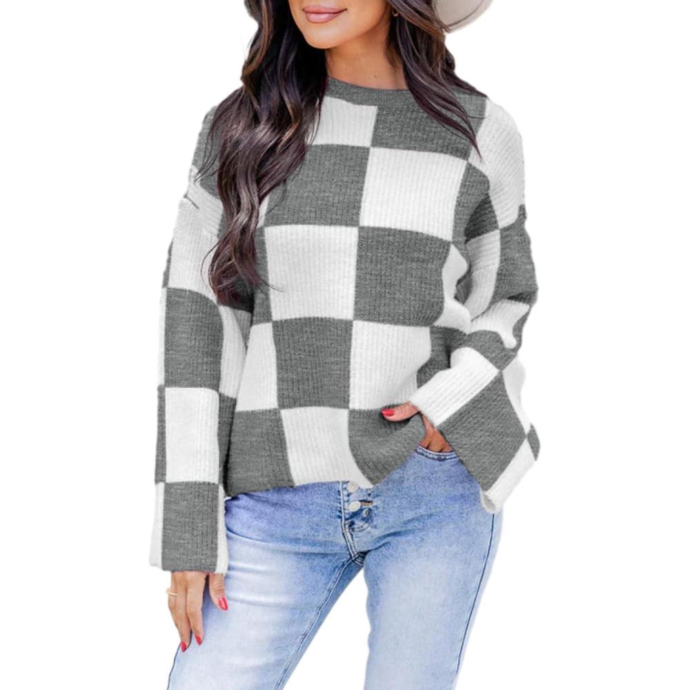 Dokotoo Womens Sweaters Crewneck Checkered Bell Sleeve Sweater Knit Pullover Tops(Gray)