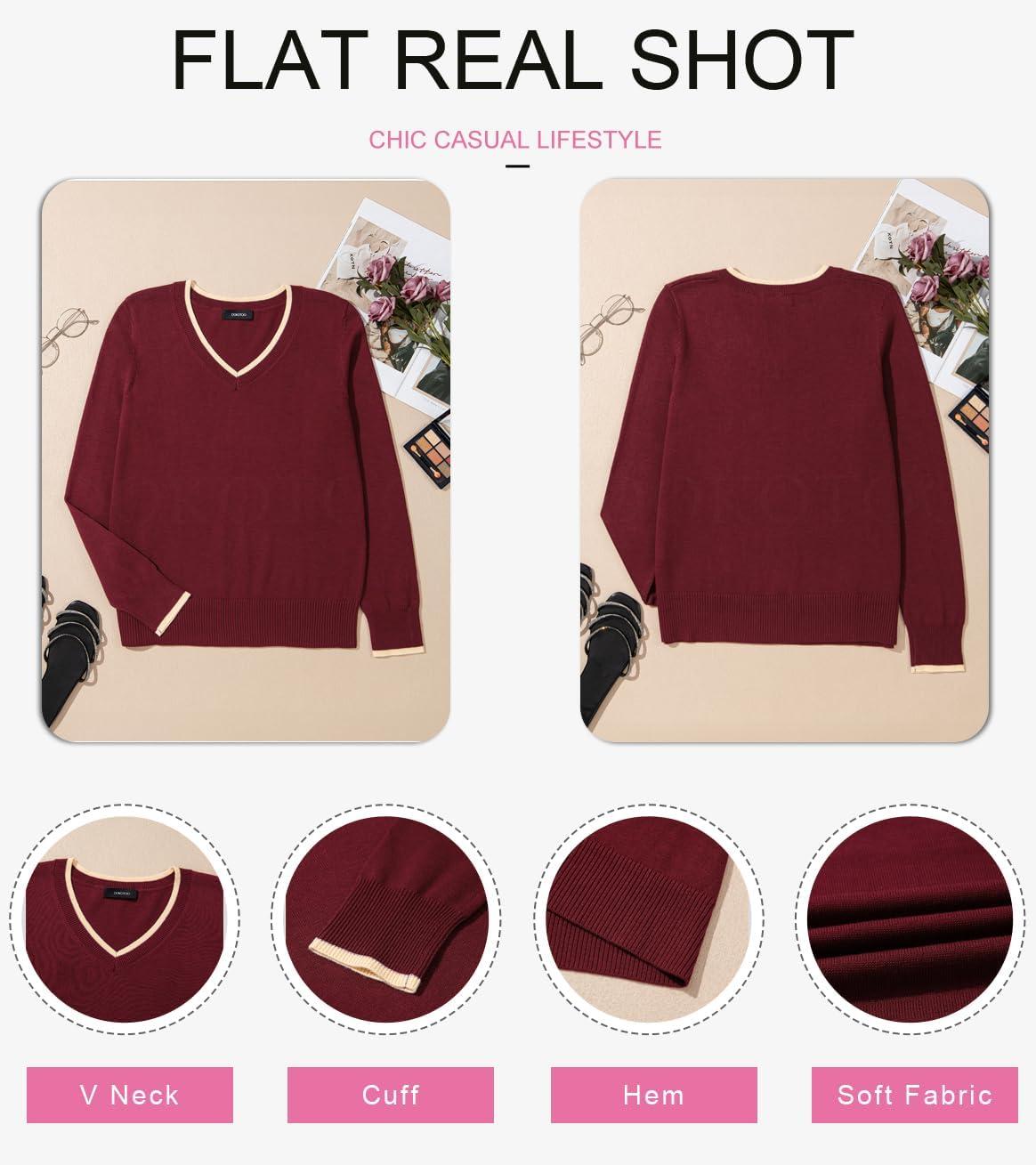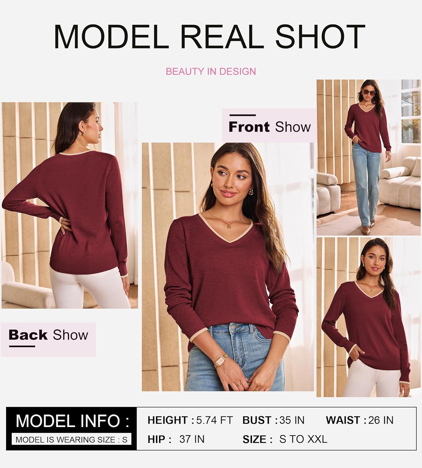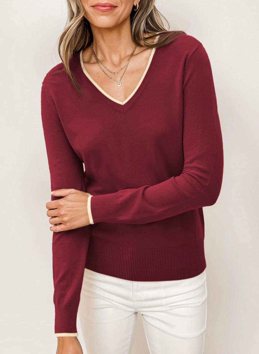 Dokotoo Womens Sweaters Dressy Casual Long Sleeve V Neck Lightweight Ribbed Knit Wool Pullover Jumper Top(Red)