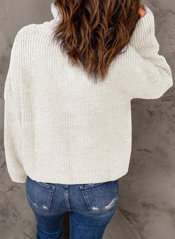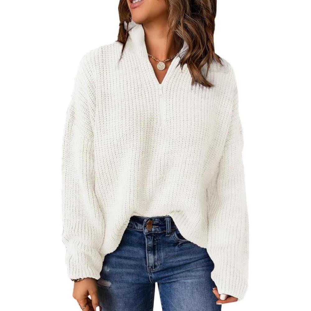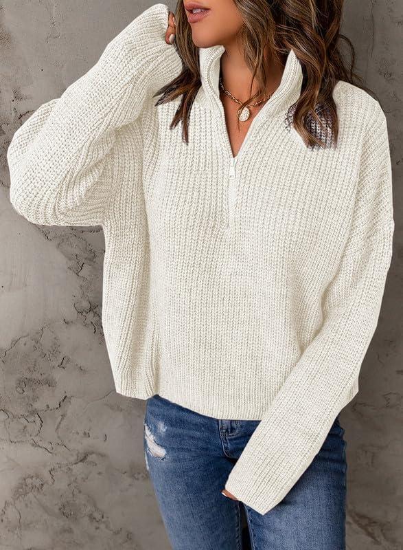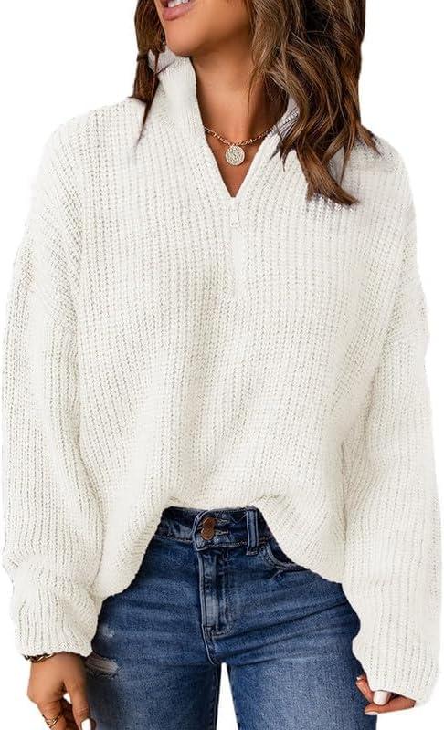 Dokotoo Womens Sweaters Long Sleeve 1/4 Zip Pullover Polo V Neck Dressy Casual Tops(B White)