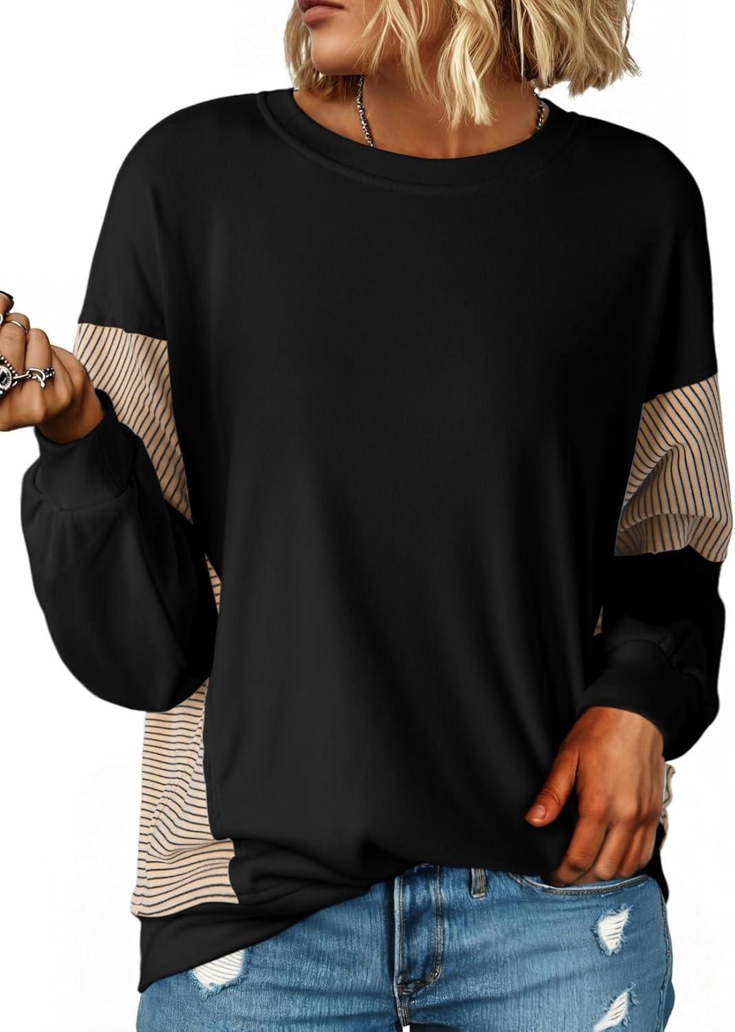 Dokotoo Women’s Sweatshirts Color Block Longs Sleeve Casual Crewneck Pullover Shirts Tops Fall Outfits Trendy(Black)