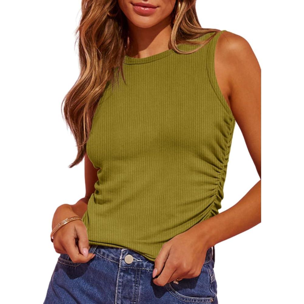 Dokotoo Womens Tank Tops Summer Sleeveless High Neck Ribbed Knit Slim Fitted Blouse Side Ruched Basic Tees Shirts(Jungle Green)