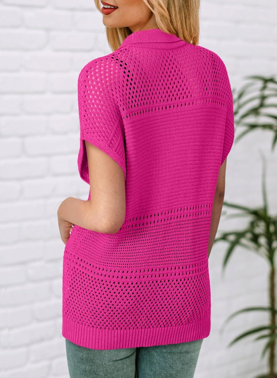 Dokotoo Womens Tops 2025 Summer Spring Casual V Neck Short Sleeve Sweater Crochet Tops Casual Dressy Blouses(Hot Pink)