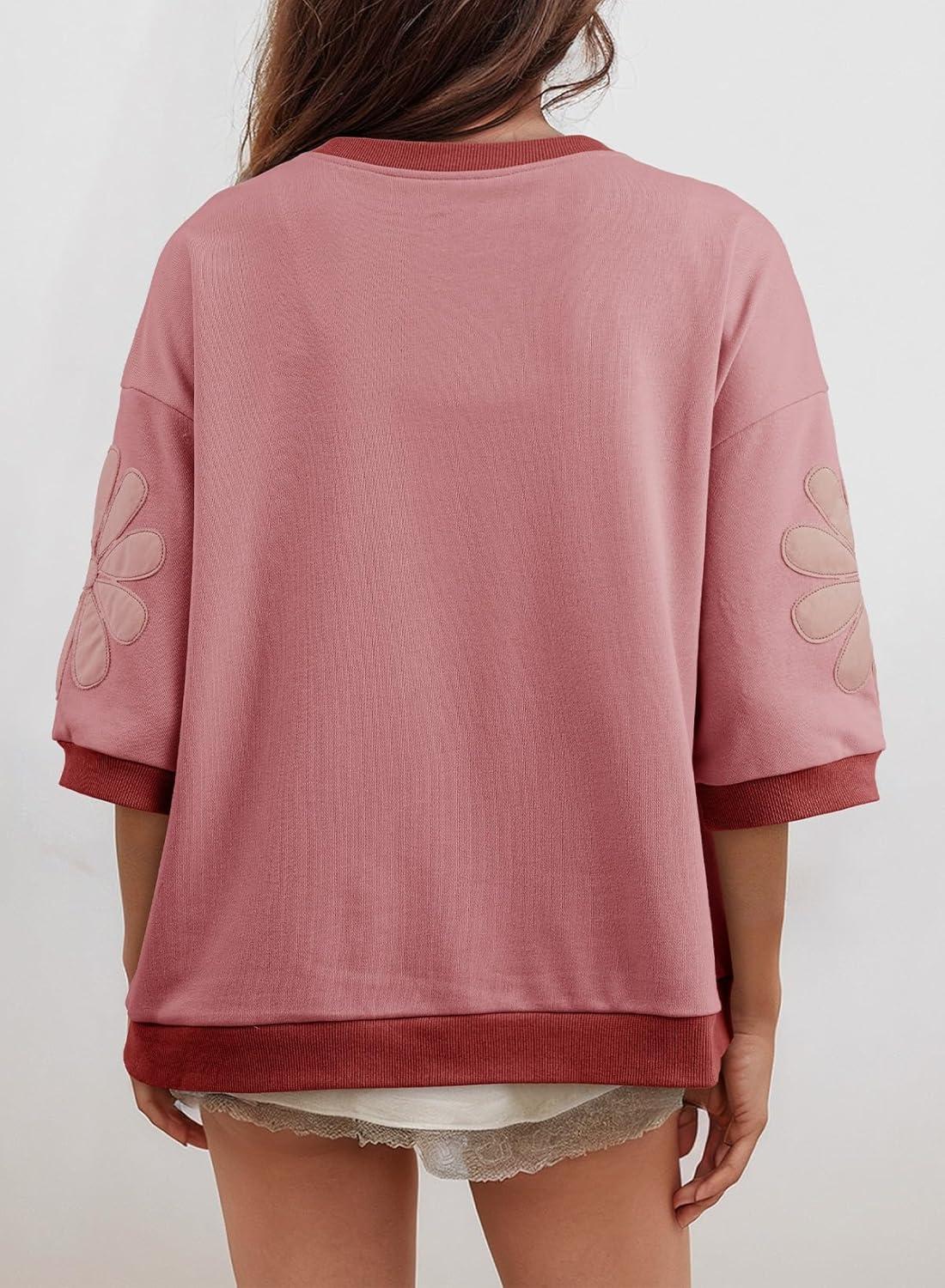Dokotoo Womens Tops 2026 Summer 3/4 Sleeve Floral Sweatshirt Casual Crew Neck Oversized Colorblock Blouses(Pink)