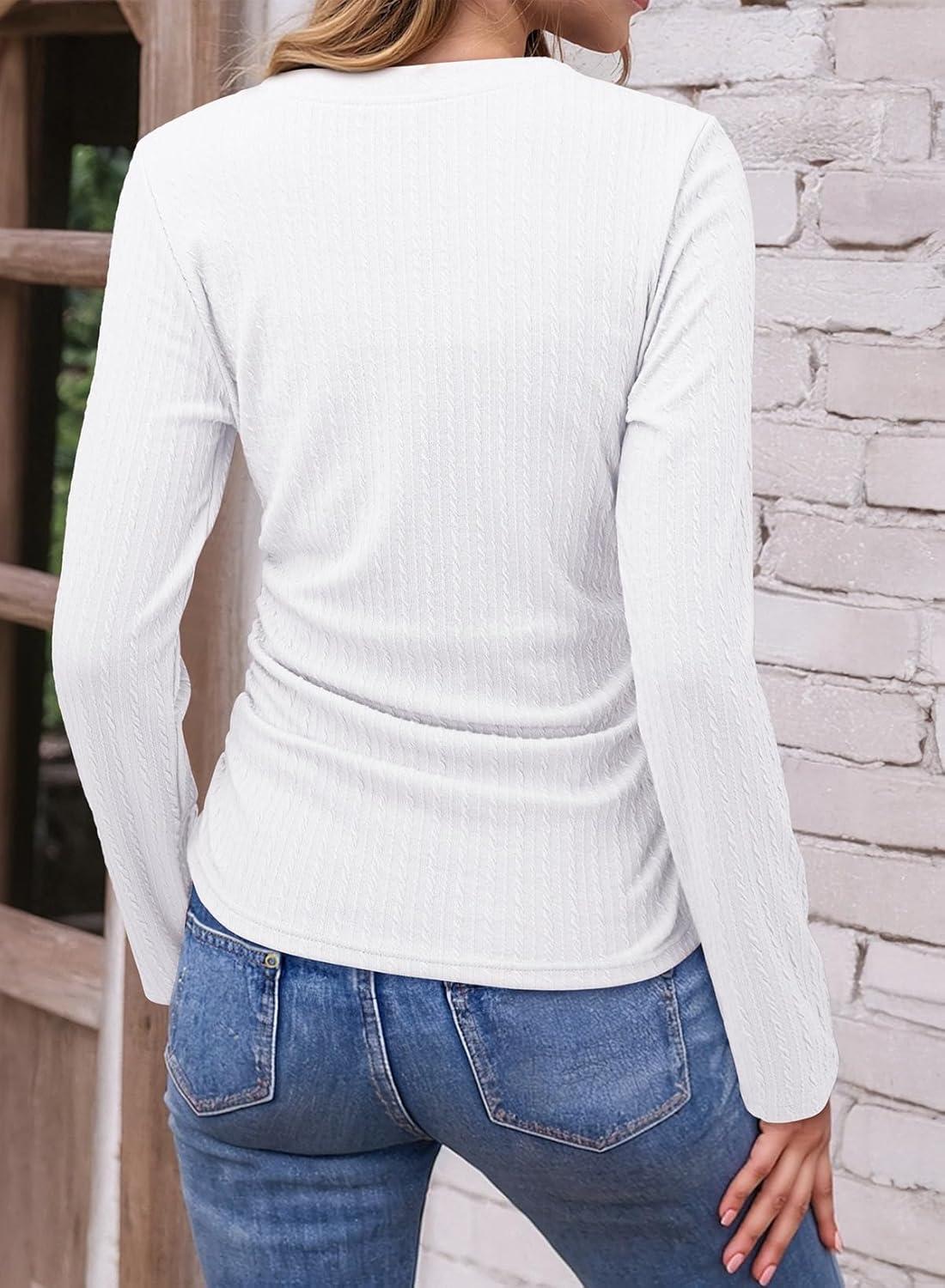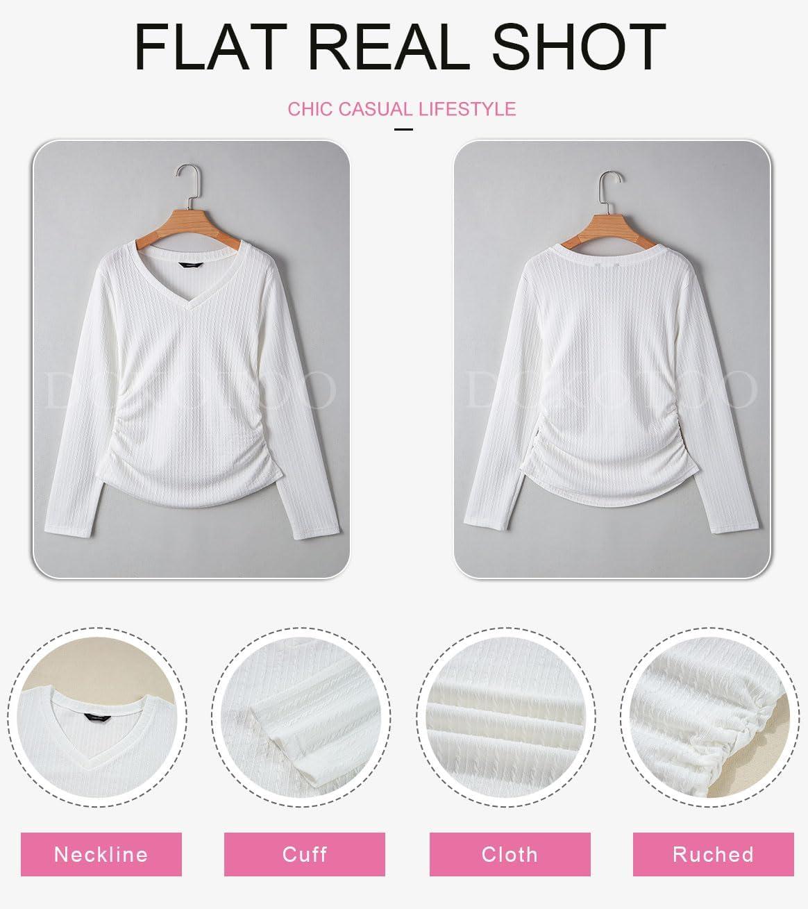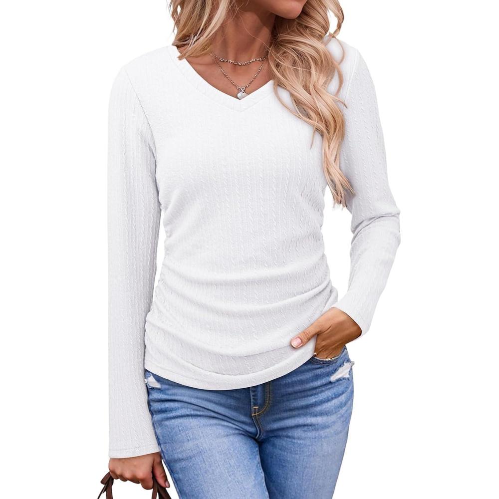 Dokotoo Womens Tops Casual V Neck Long Sleeve Shirts for Women Fashion Solid Ruched Basic Tunics Blouses(White)