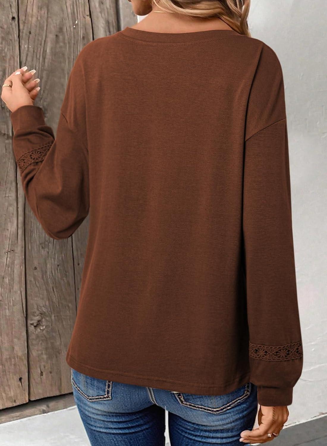 Dokotoo Womens Tops Dressy Casual 2025 Long Sleeve Pullover V Neck Fall Shirts Hollow Out Lace Embroidered Blouse(Brown)