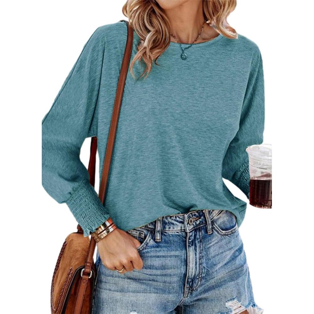 Dokotoo Womens Tops Long Sleeve Tops Shirts 2025 Spring Trendy Business Work Loose Basic T-Shirts(Peacock Blue)