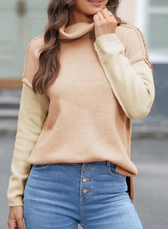 Dokotoo Womens Turtleneck Sweaters Casual Long Sleeve Color Block Side Slit Pullover Knit Jumper Tops(Apricot Powder)