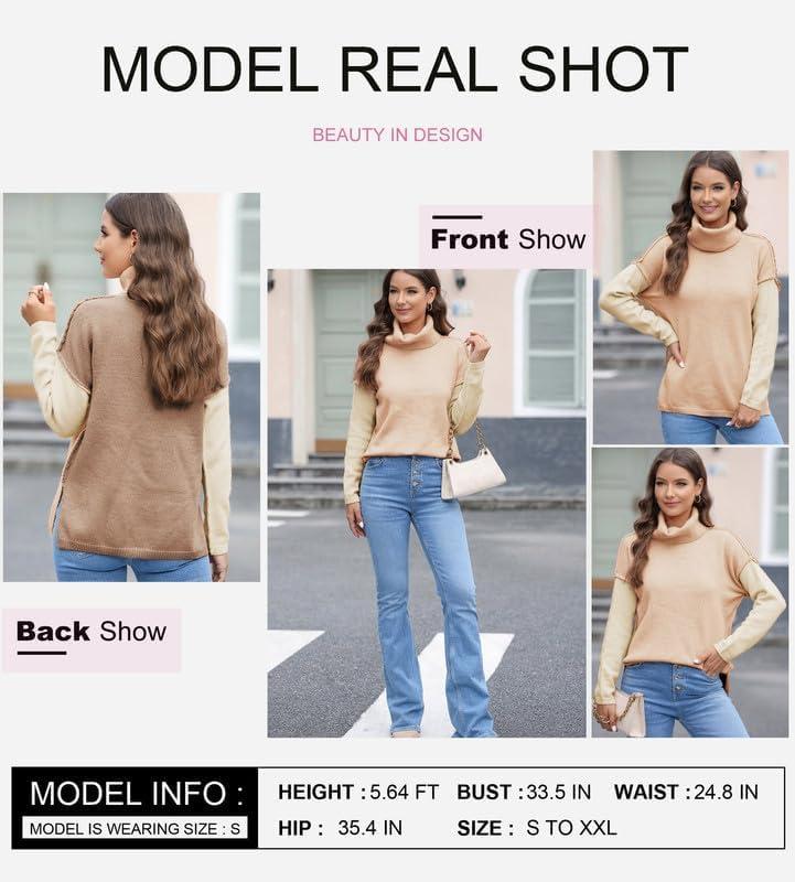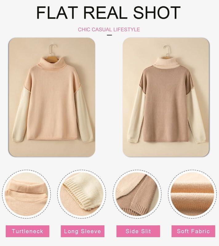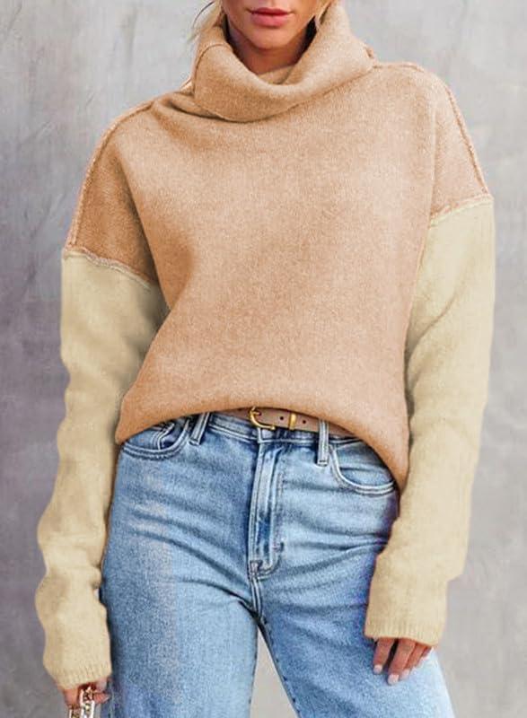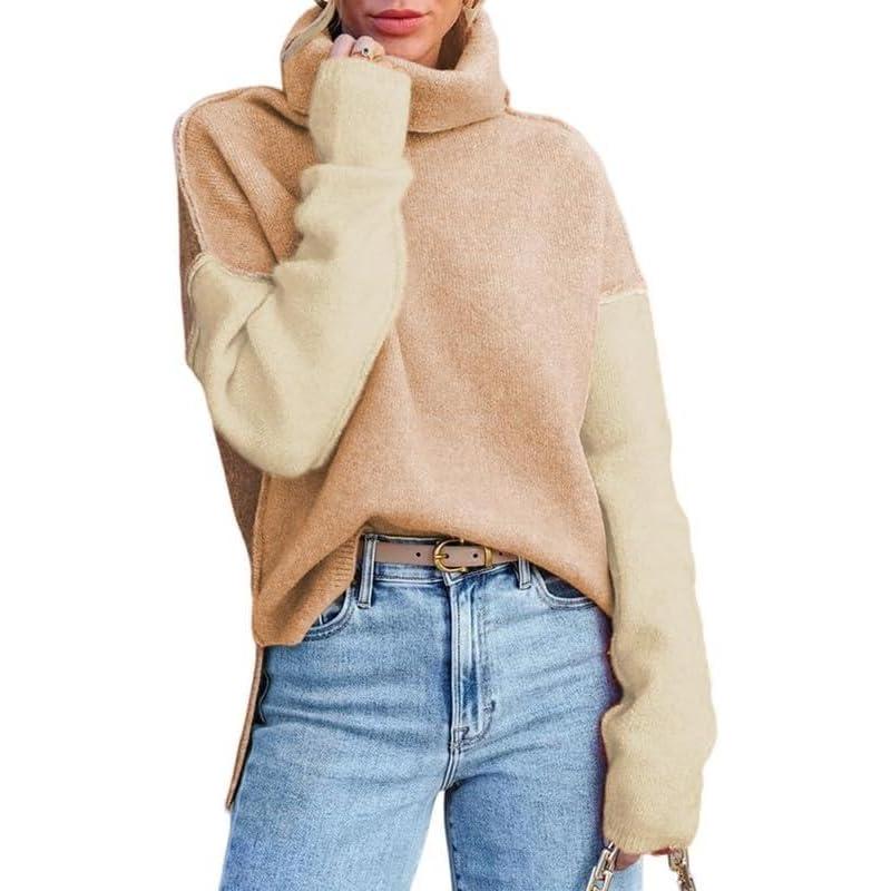 Dokotoo Womens Turtleneck Sweaters Casual Long Sleeve Color Block Side Slit Pullover Knit Jumper Tops(Maillard Color)