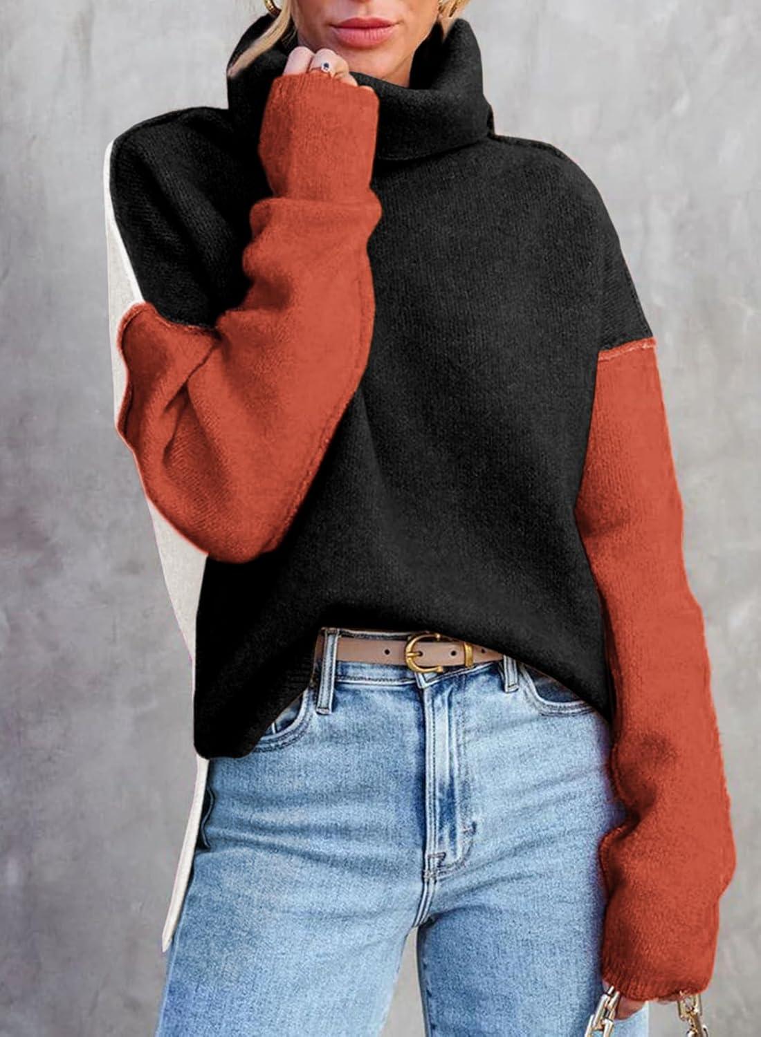 Dokotoo Womens Turtleneck Sweaters Casual Long Sleeve Color Block Side Slit Pullover Knit Jumper Tops(Black)