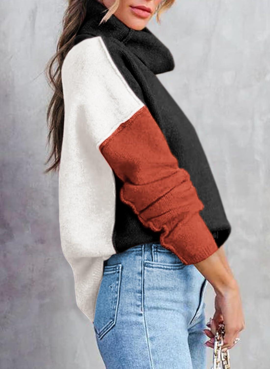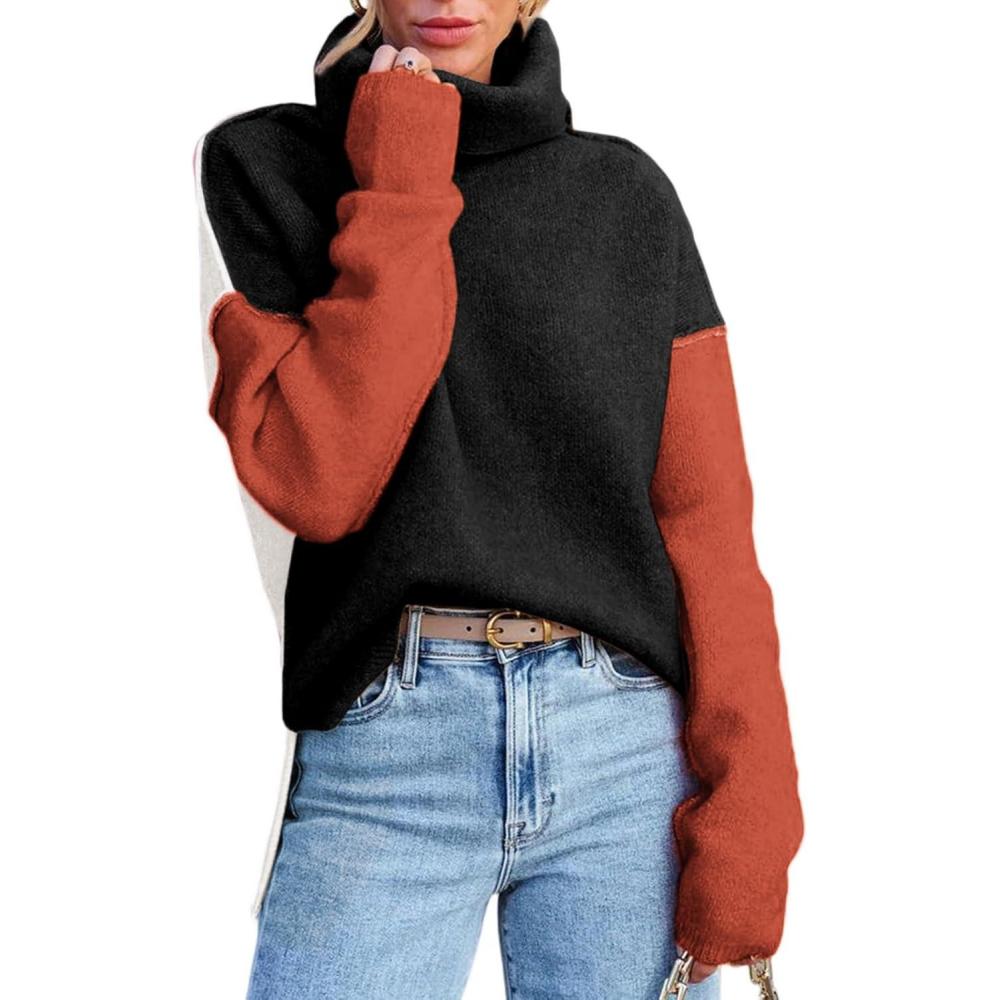 Dokotoo Womens Turtleneck Sweaters Casual Long Sleeve Color Block Side Slit Pullover Knit Jumper Tops(Maillard Color)
