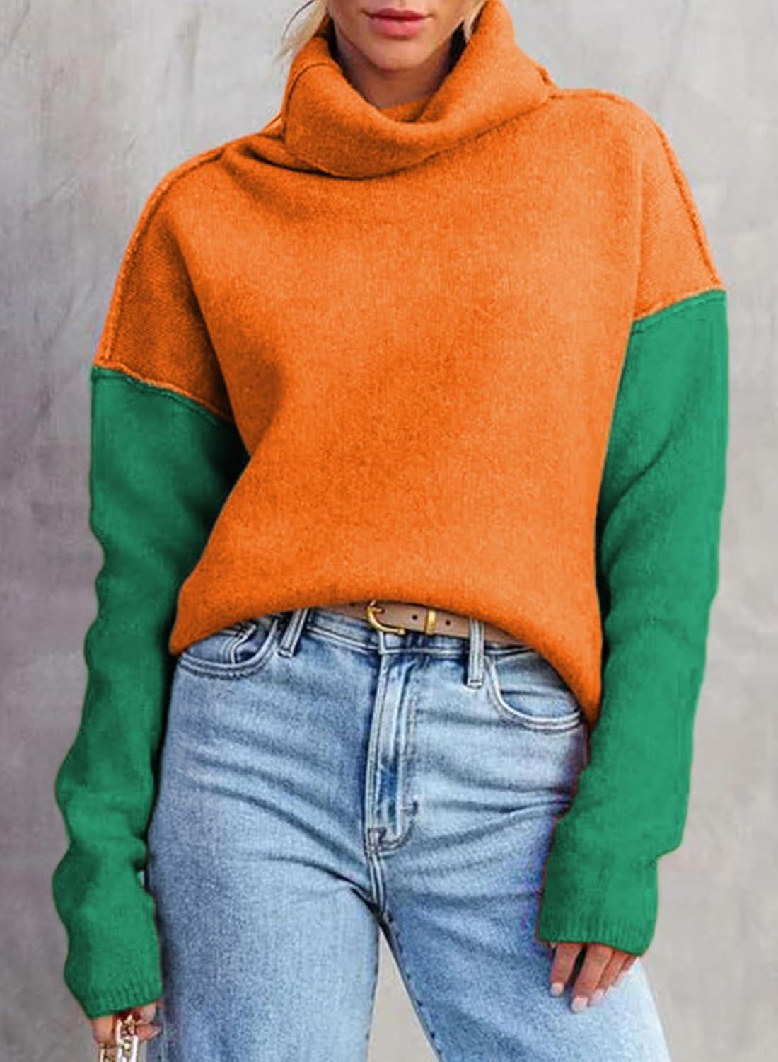 Dokotoo Womens Turtleneck Sweaters Casual Long Sleeve Color Block Side Slit Pullover Knit Jumper Tops(Peach)