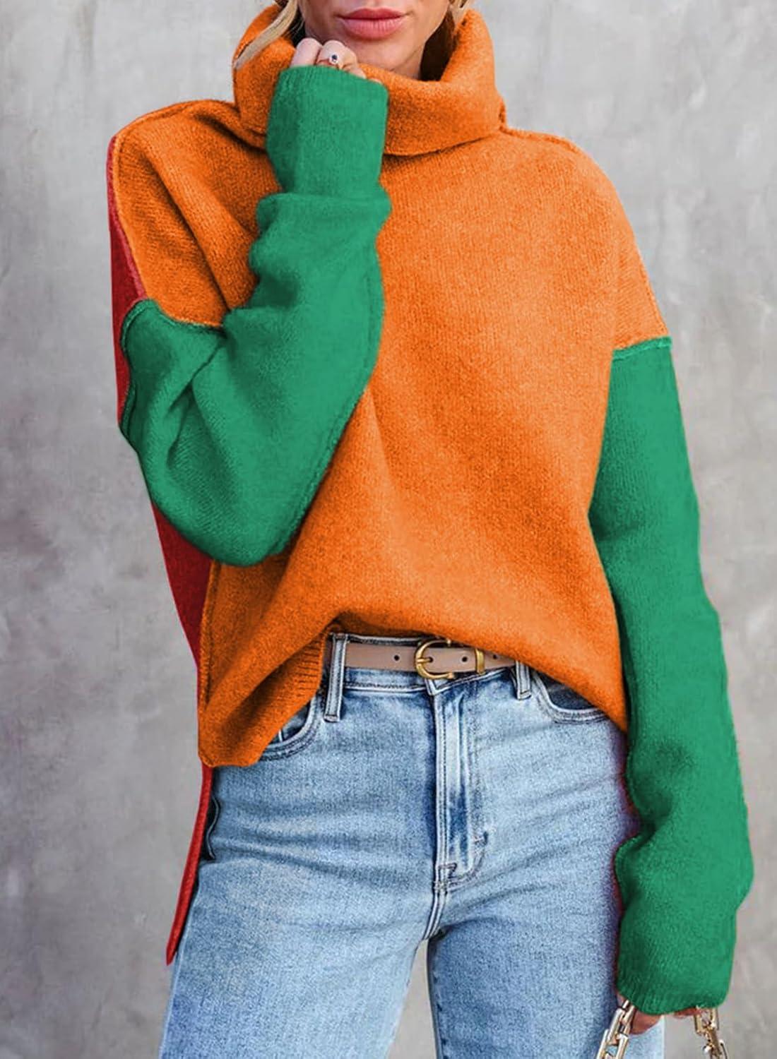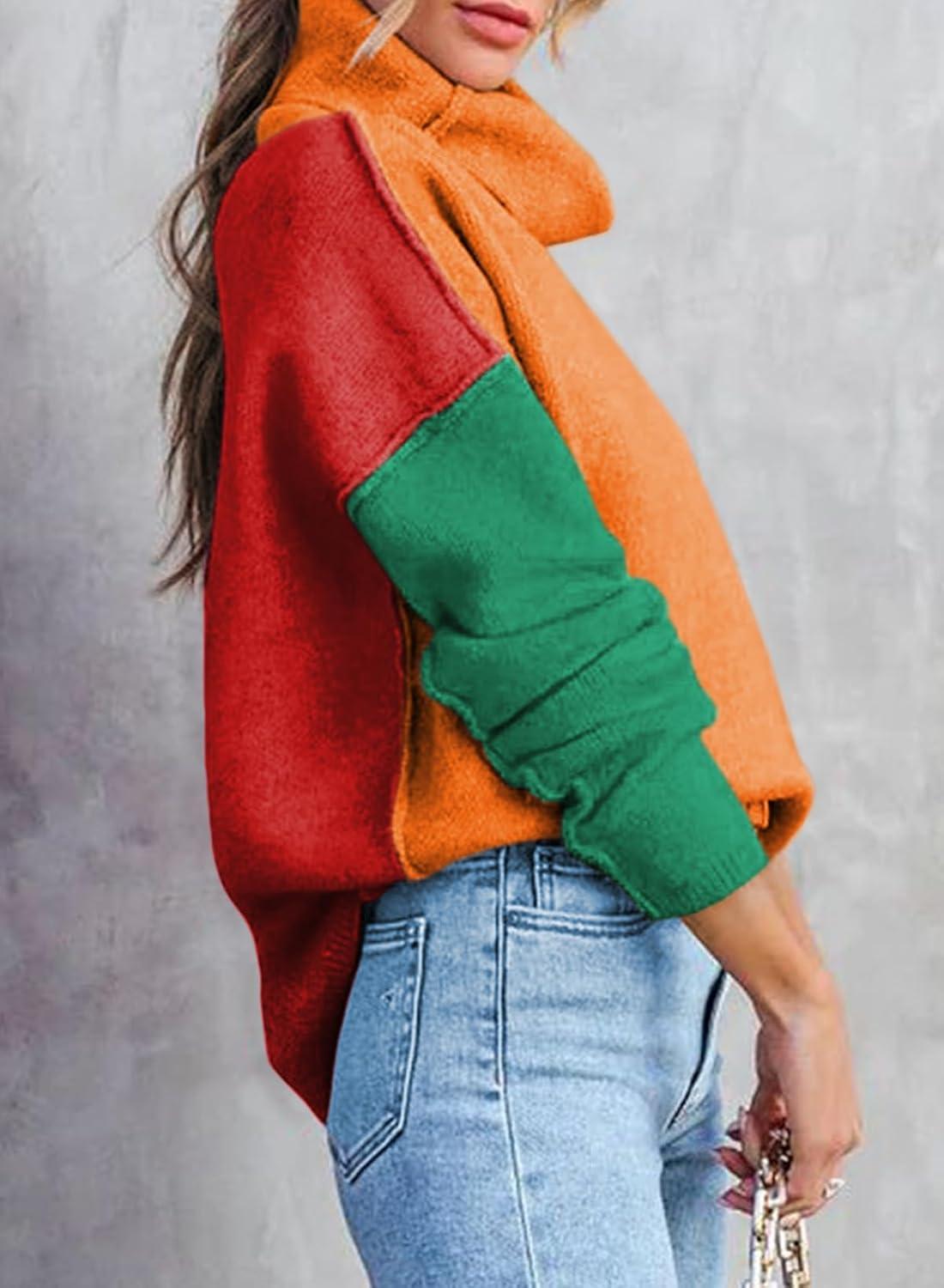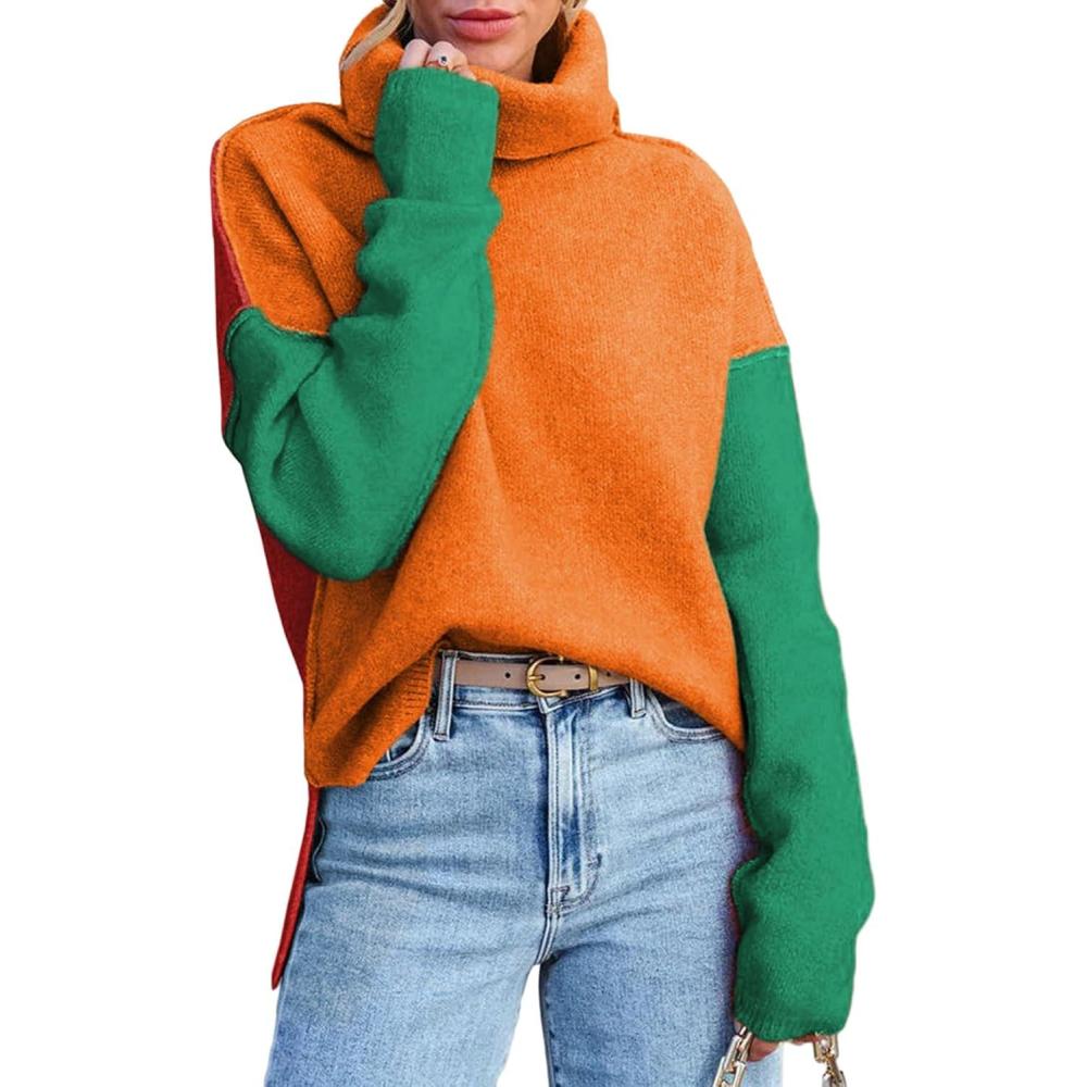 Dokotoo Womens Turtleneck Sweaters Casual Long Sleeve Color Block Side Slit Pullover Knit Jumper Tops(Christmas)