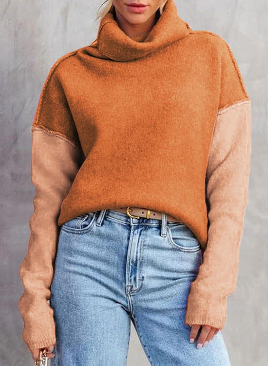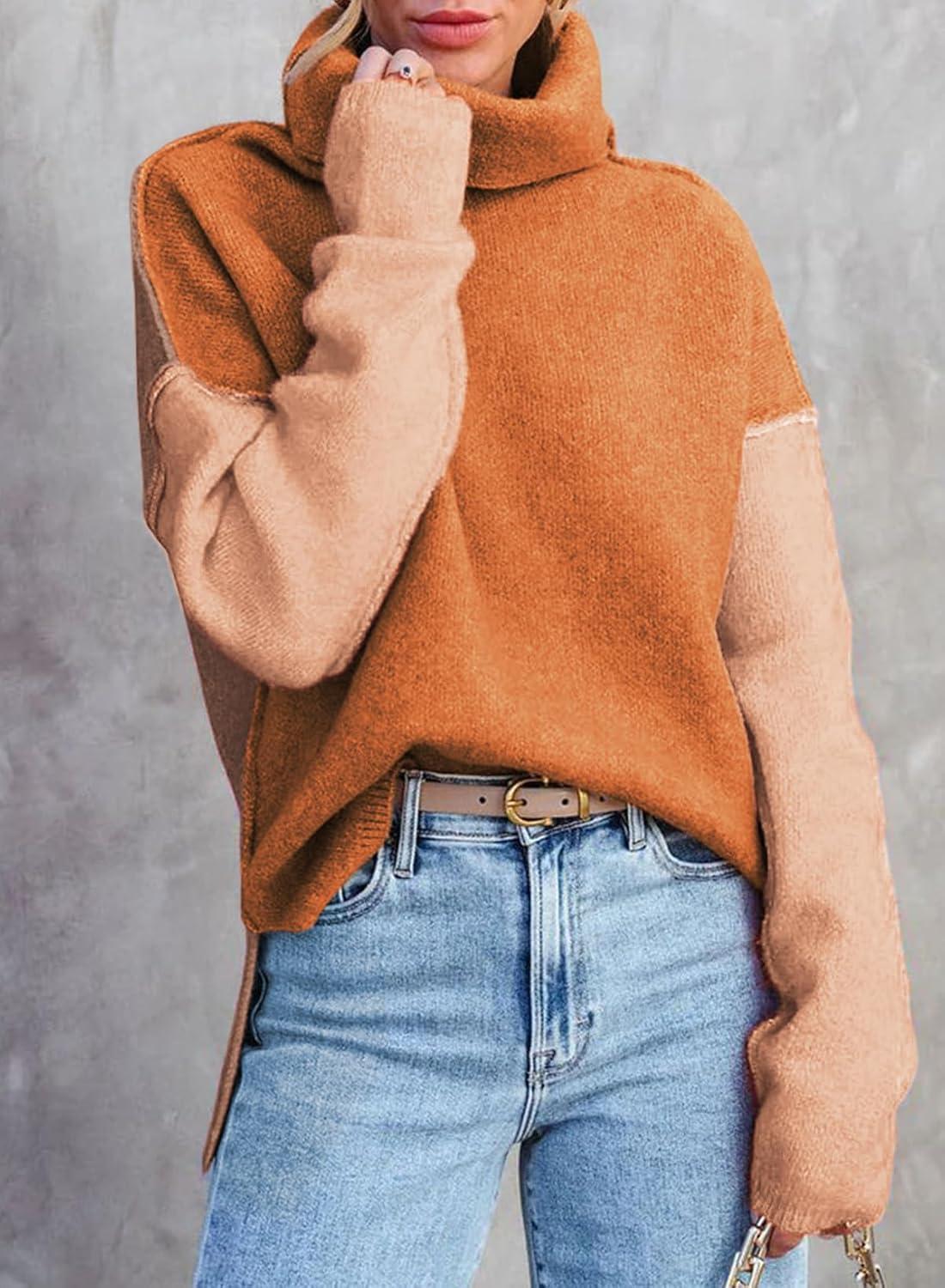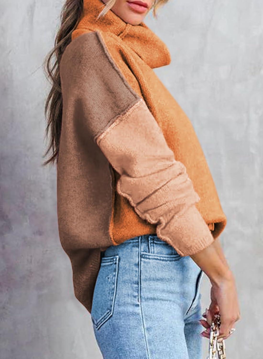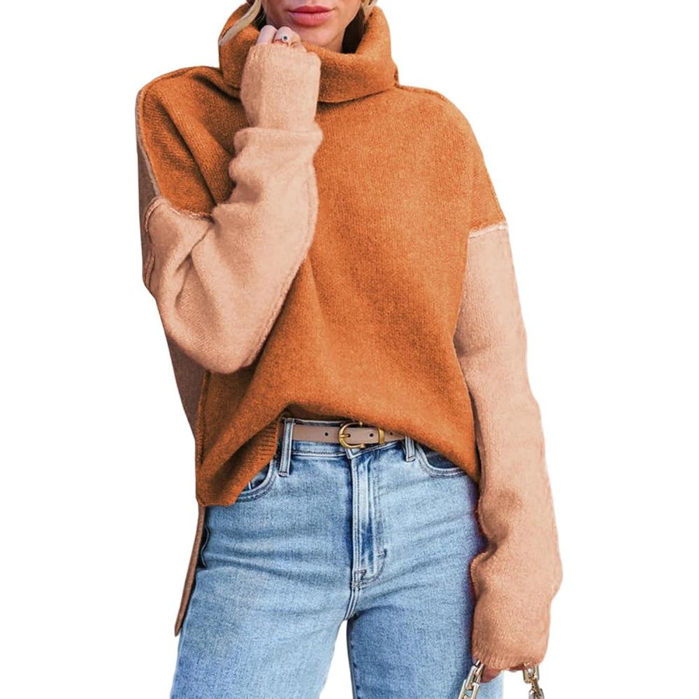 Dokotoo Womens Turtleneck Sweaters Casual Long Sleeve Color Block Side Slit Pullover Knit Jumper Tops(Maillard Color)