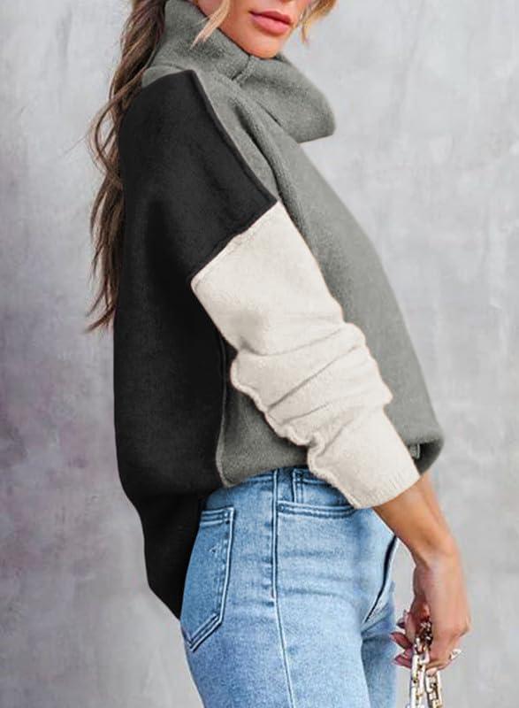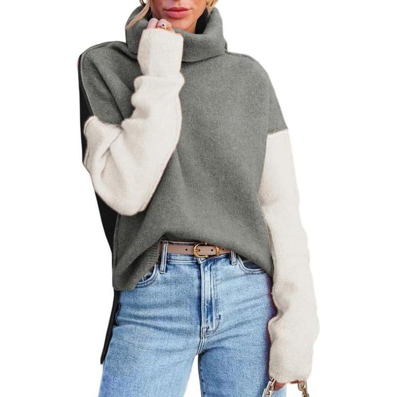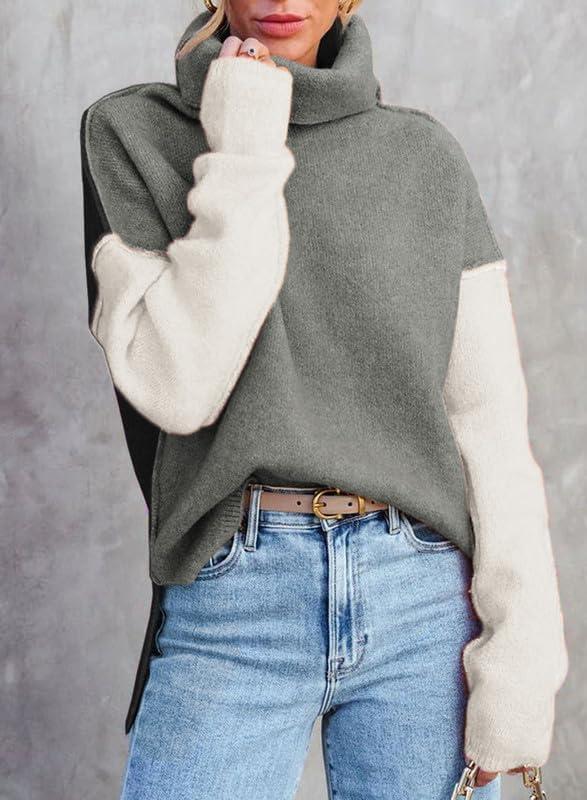 Dokotoo Womens Turtleneck Sweaters Casual Long Sleeve Color Block Side Slit Pullover Knit Jumper Tops(Medium Grey)
