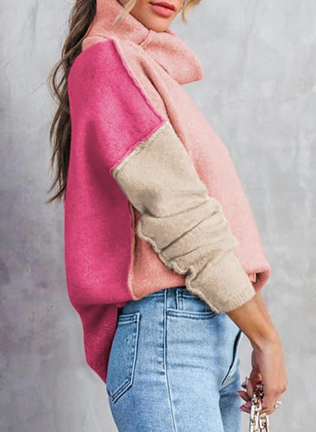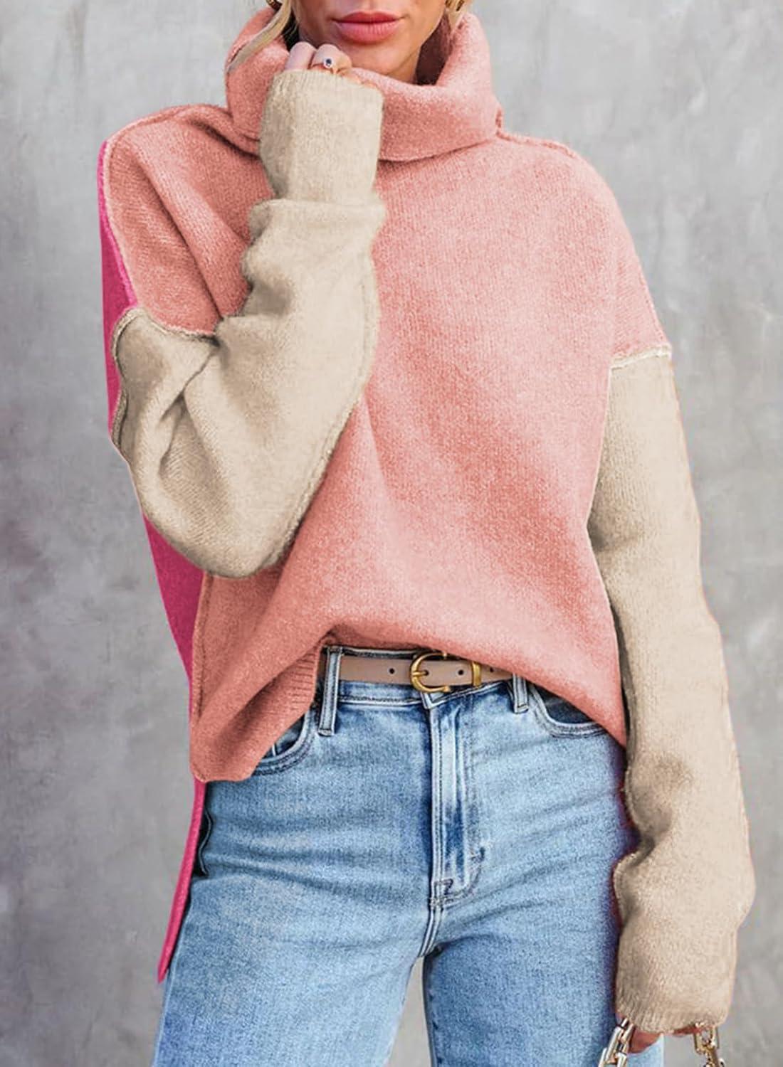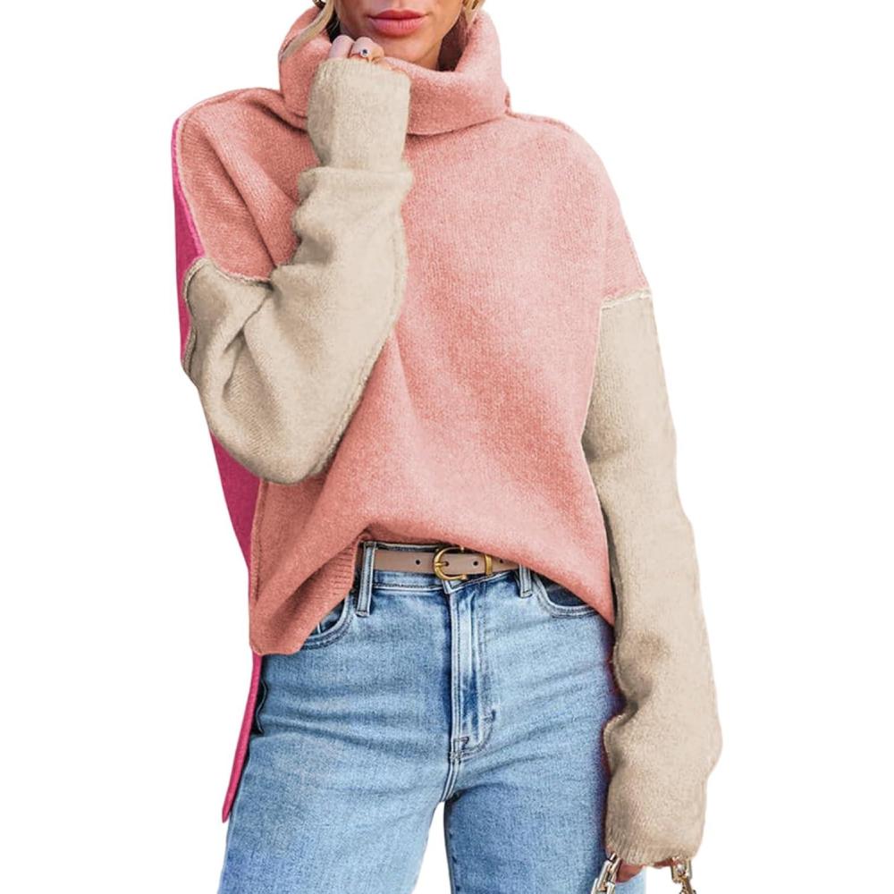 Dokotoo Womens Turtleneck Sweaters Casual Long Sleeve Color Block Side Slit Pullover Knit Jumper Tops(Peach)